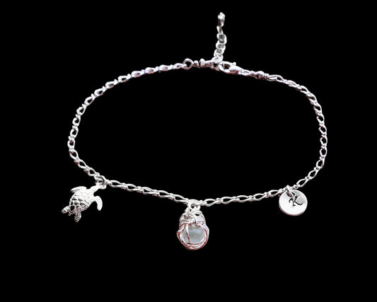 Deluxe Personalized Aqua Blue Beach Glass, Turtle, Initial, Infinity Ankle Bracelet-Anklet