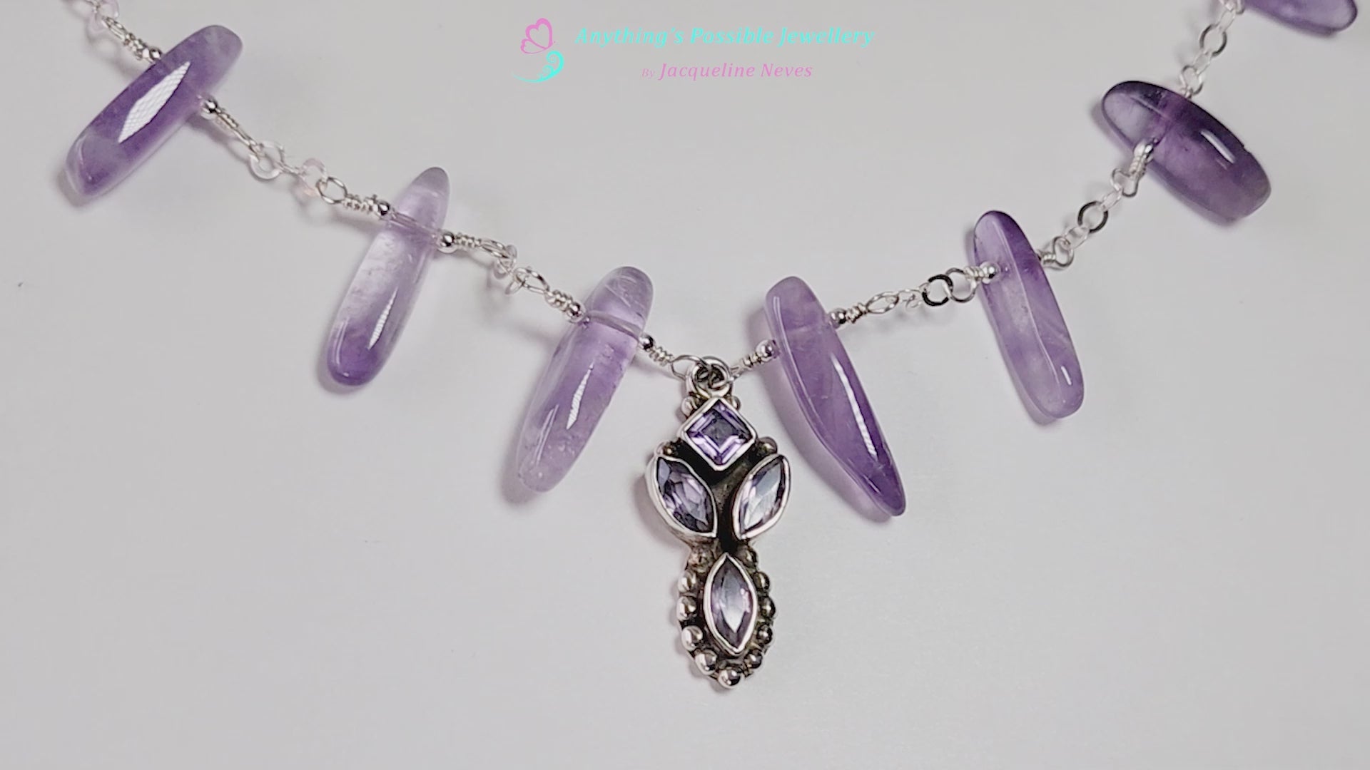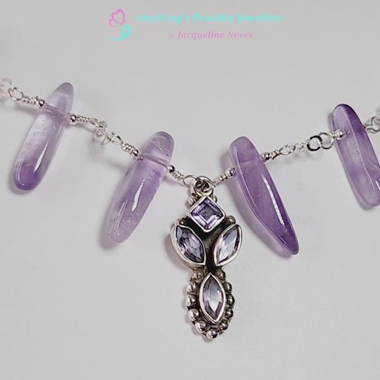 Eco Friendlier, one of a kind Amethyst necklace featuring a stunning pendant set with faceted Amethyst in the centre of the necklace surrounded on either side with long polished Amethyst stones accented with little (2mm round) Sterling Silver beads. The stones and beads are securely wrapped with Sterling Silver wire to the sparkly flat cable link chain.
