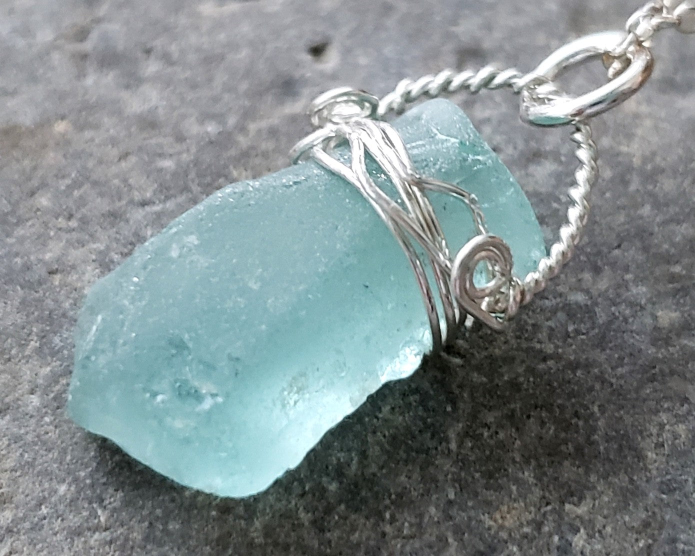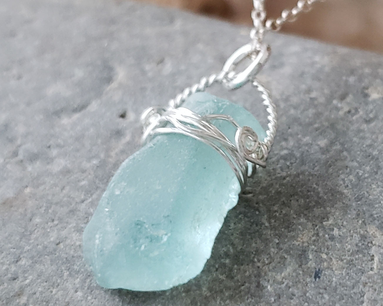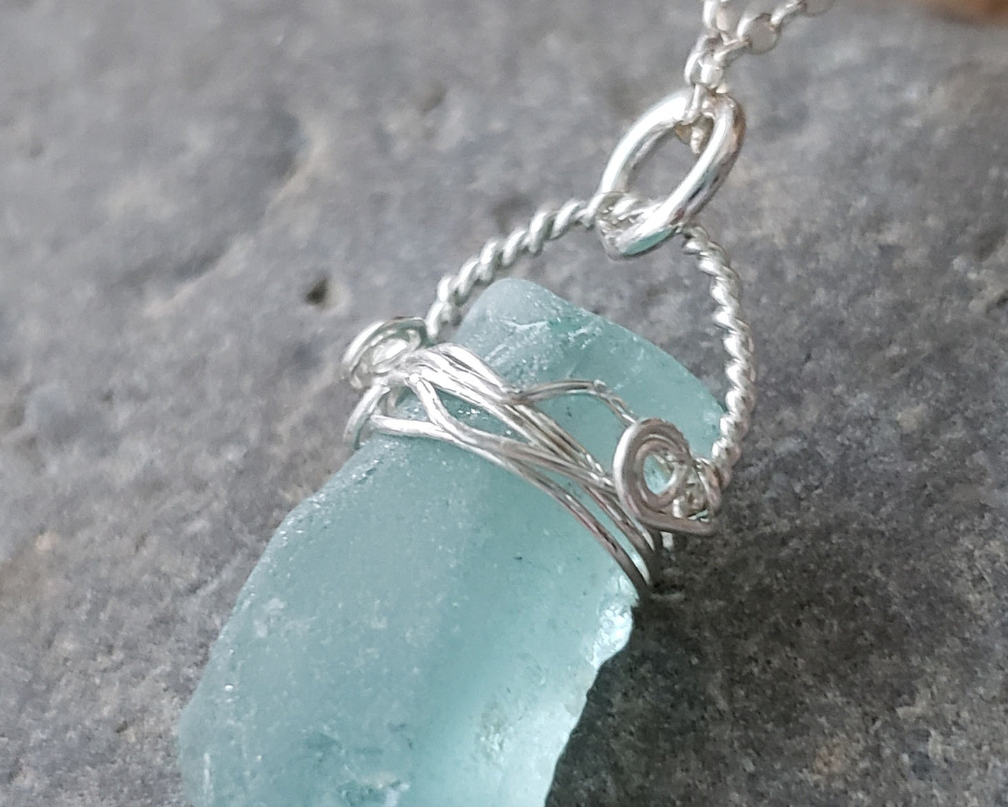 I wrapped the rare aquamarine color glass with a single piece of Sterling Silver wire to represent the movement of water, never ending waves around the glass.