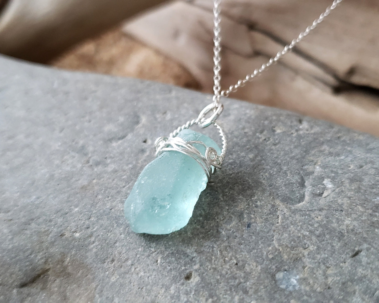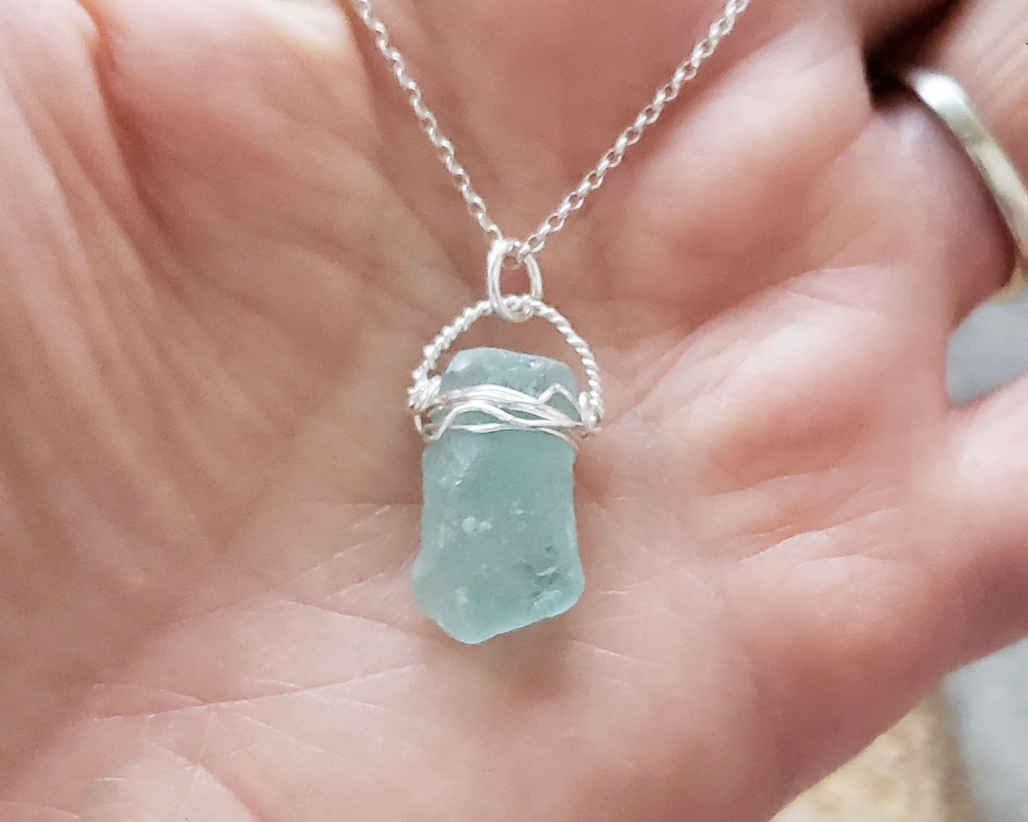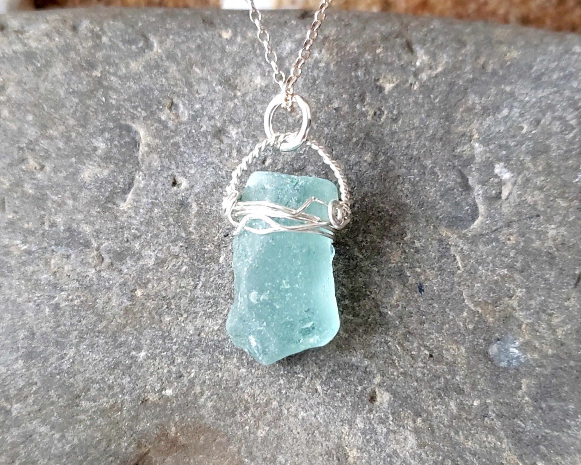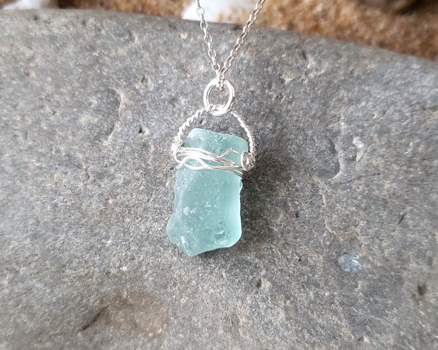 I wrapped the rare aquamarine color glass with a single piece of Sterling Silver wire to represent the movement of water, never ending waves around the glass.