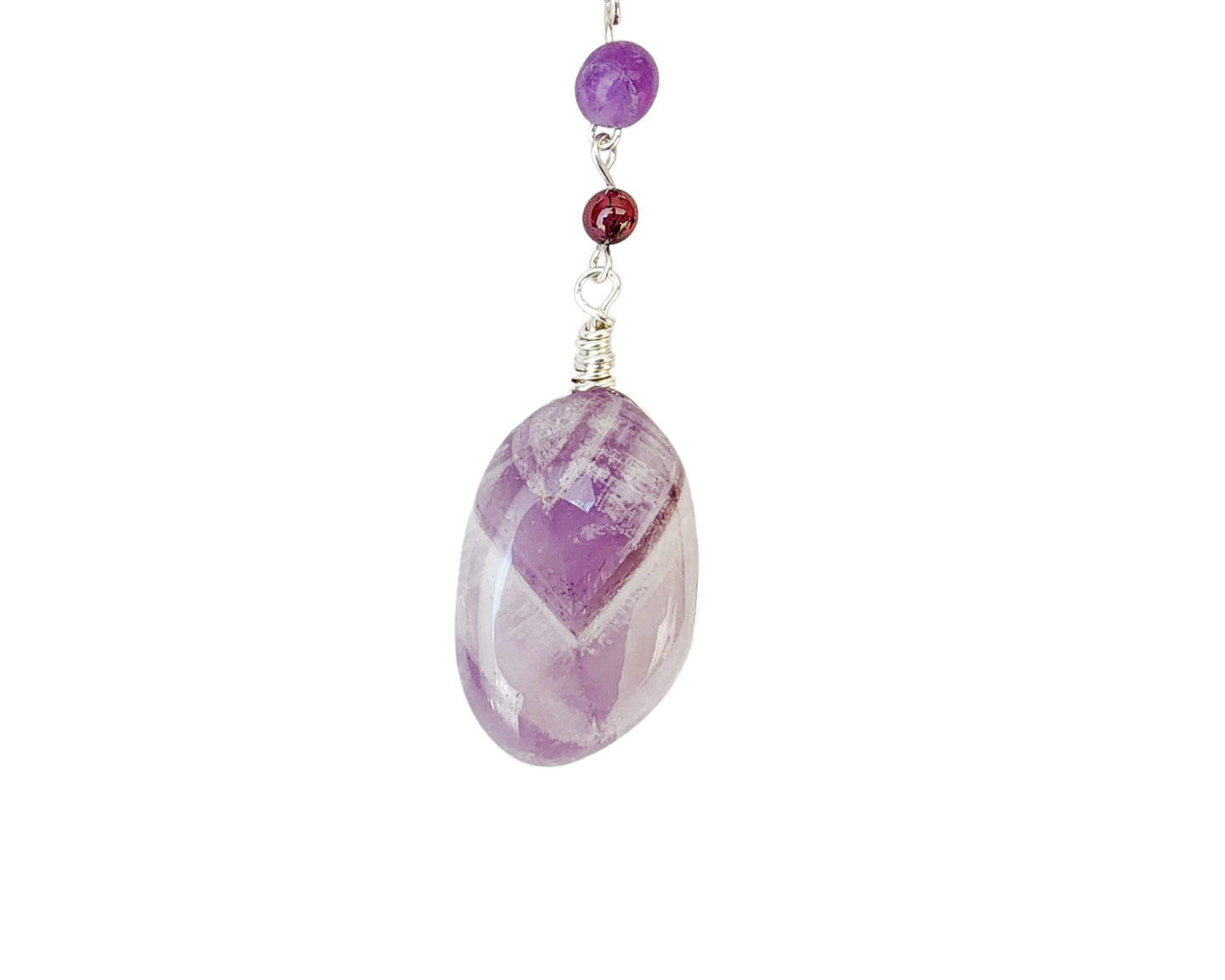 Eco Friendly, Sustainable, Art Deco Style Amethyst, Garnet and Rose Quartz Necklace made with Upcycled Vintage and almost Vintage Gemstones. handcrafted with Sterling Silver, a rounded oval shape Chevron Amethyst, round polished purple Vintage Amethyst, Older Rose Quartz (could be Vintage) older smaller Amethyst and Garnets (at least 20 years old).
