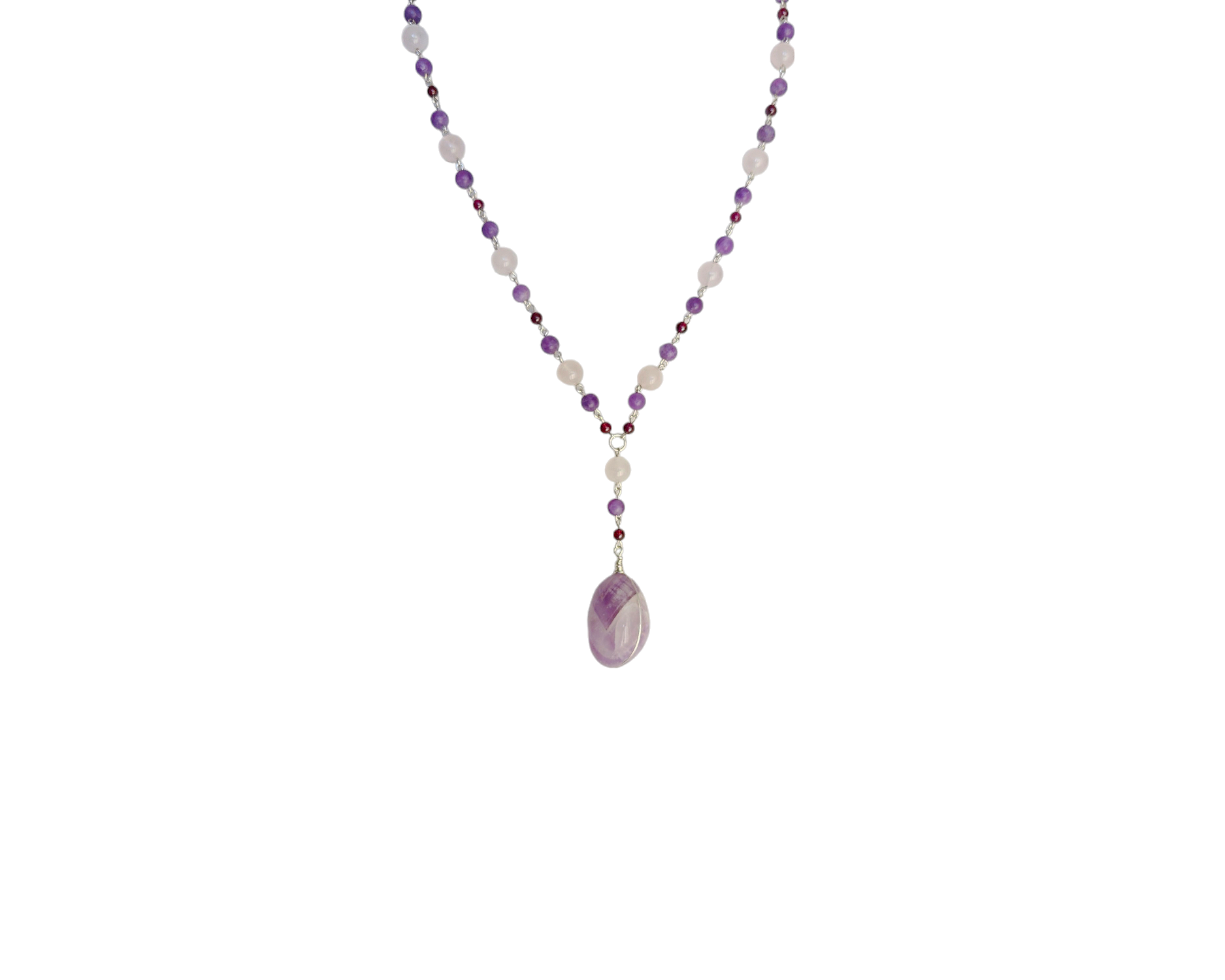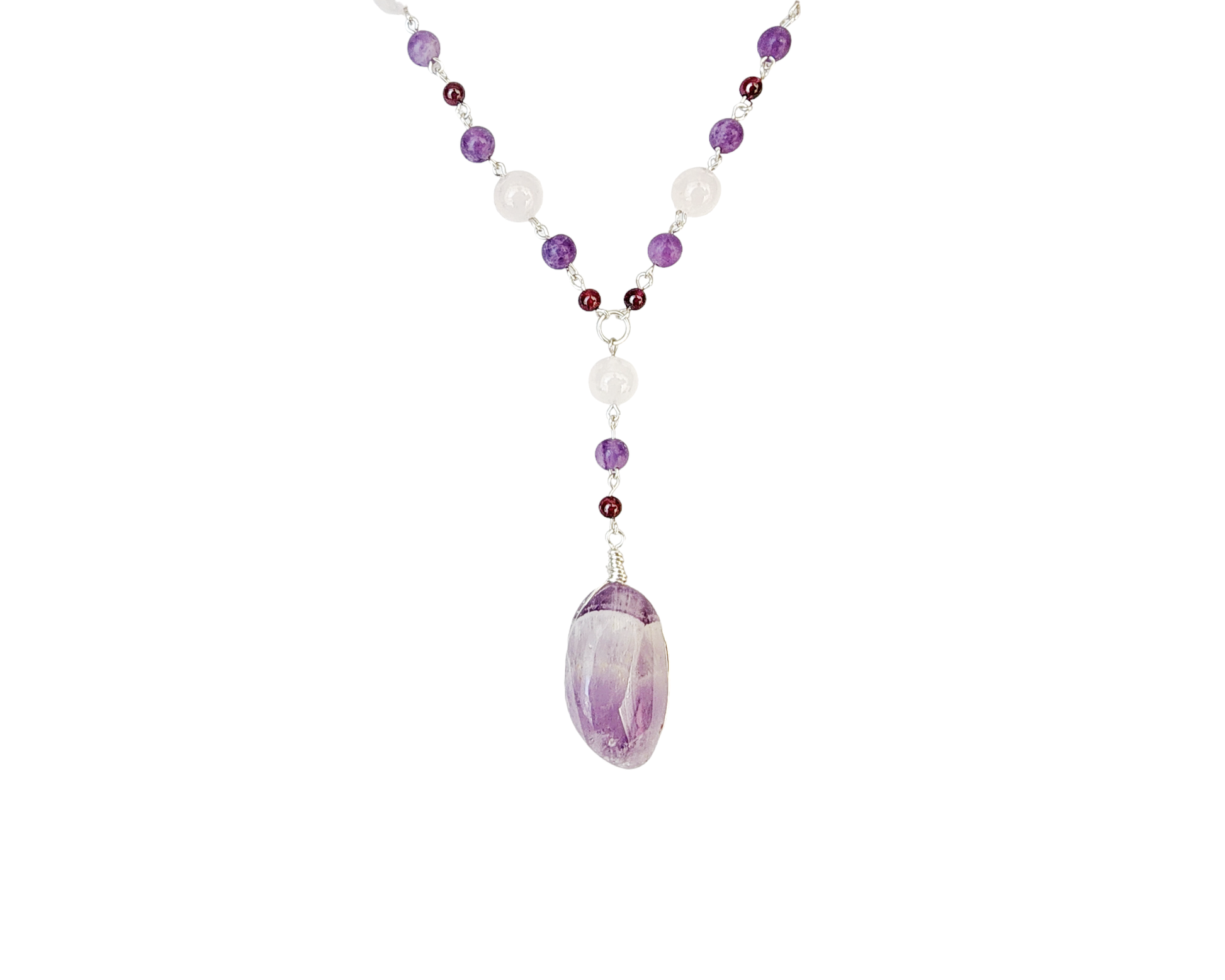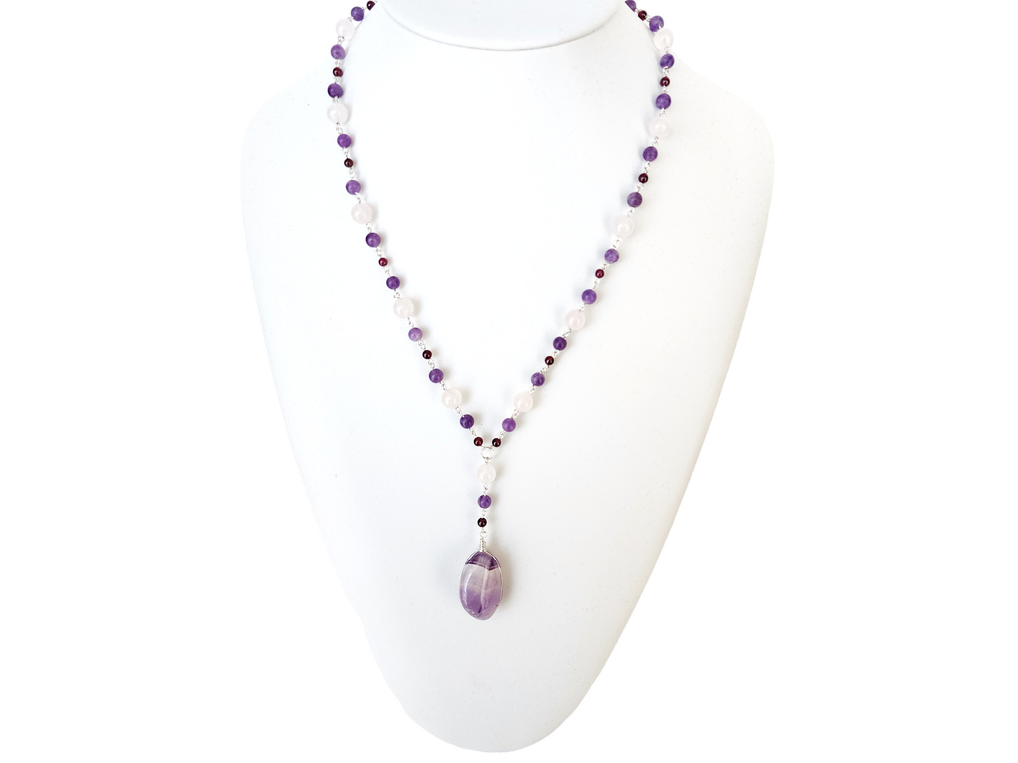 The necklace is a Y style featuring a stunning Vintage Chevron Amethyst Pendant (3.9cm) 1 10/16”” long with Twenty-Seven round satin finished Amethyst stones (27 x 5mm), Thirteen round polished Vintage Rose Quartz Stones (13 x 8mm), Seventeen round polished Garnets (17 x 3.5mm).