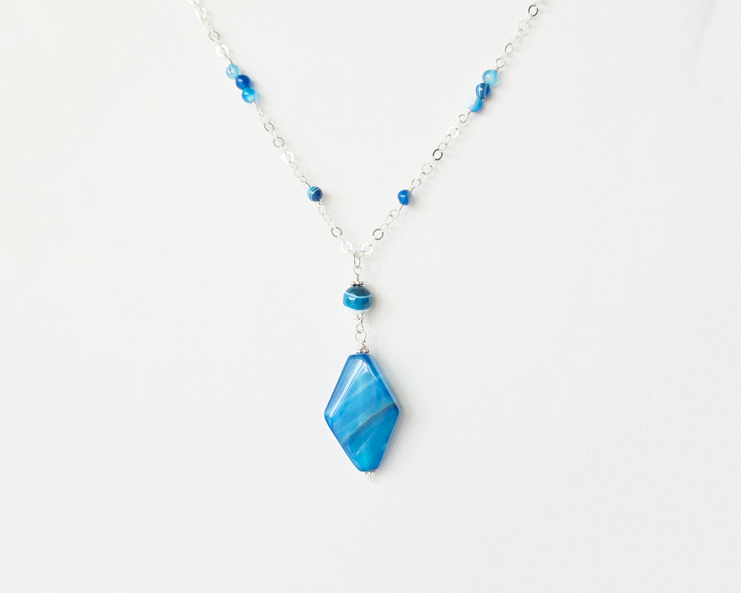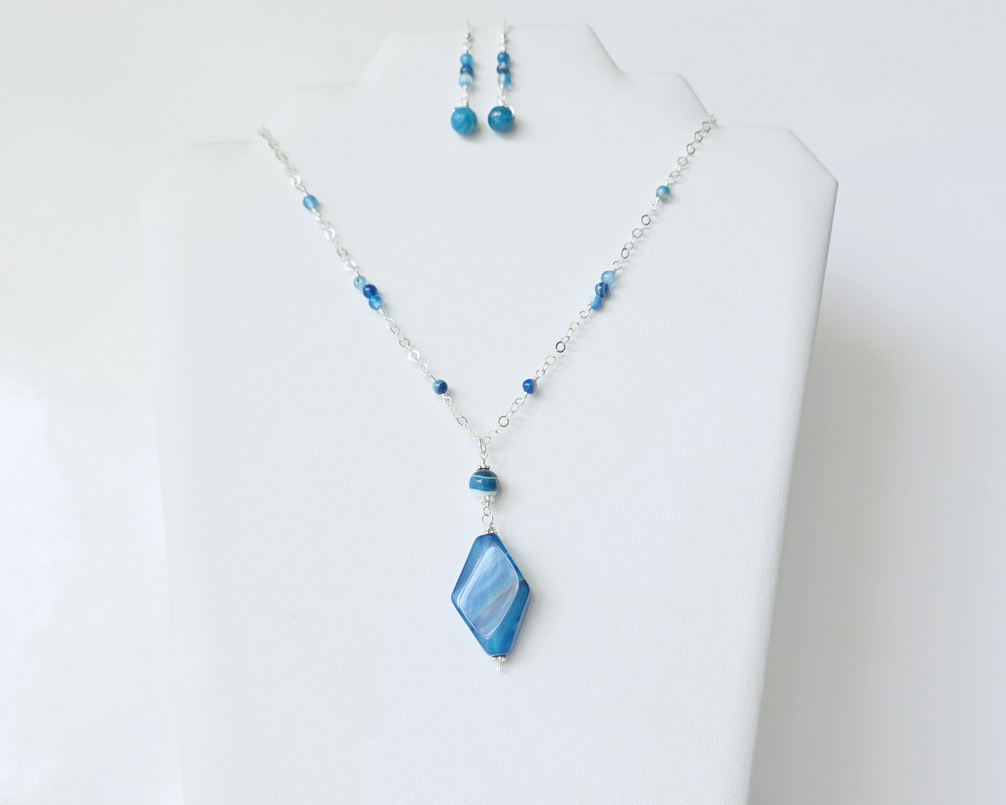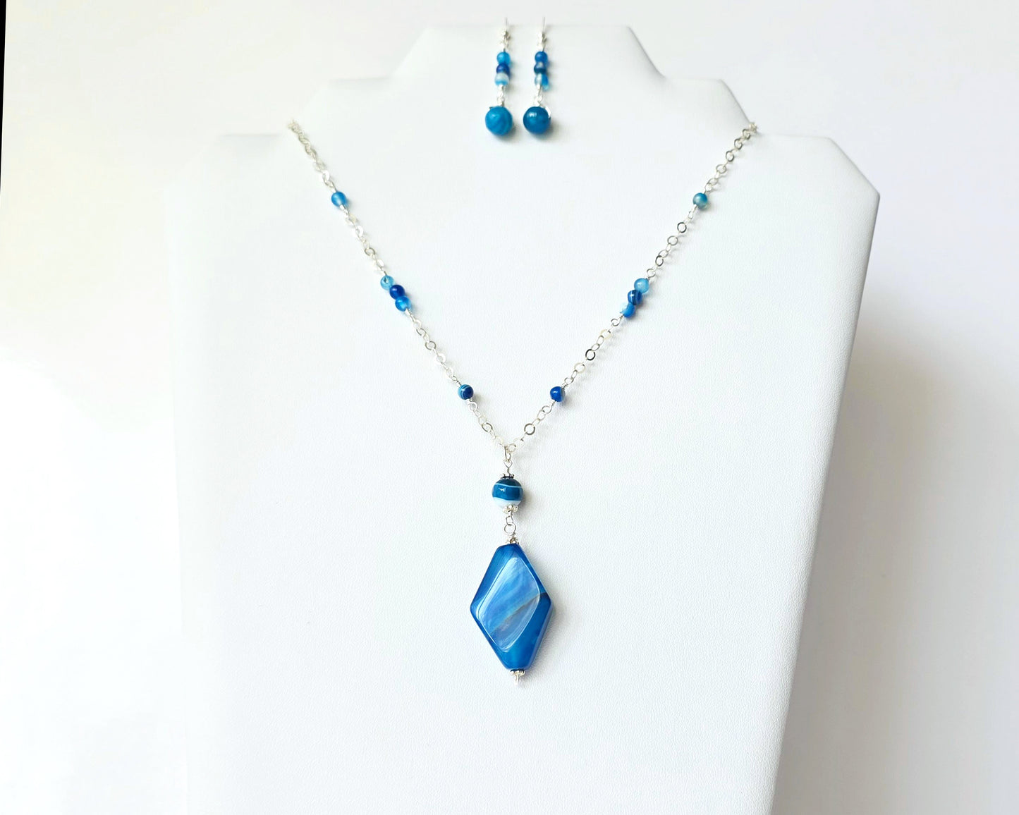 Gorgeous Art Deco inspired Blue Agate necklace and earrings set, handcrafted with 925 Sterling Silver and blue Banded Agate stone. The focal stone pendant is a diamond shape stone (3cm x 2cm) with an round faceted stone above (8mm). The necklace is made with sparkly flat cable link chain and small (4mm) stones. The lovely blue stones are securely wrapped with Sterling Silver wire, connected to the chain.