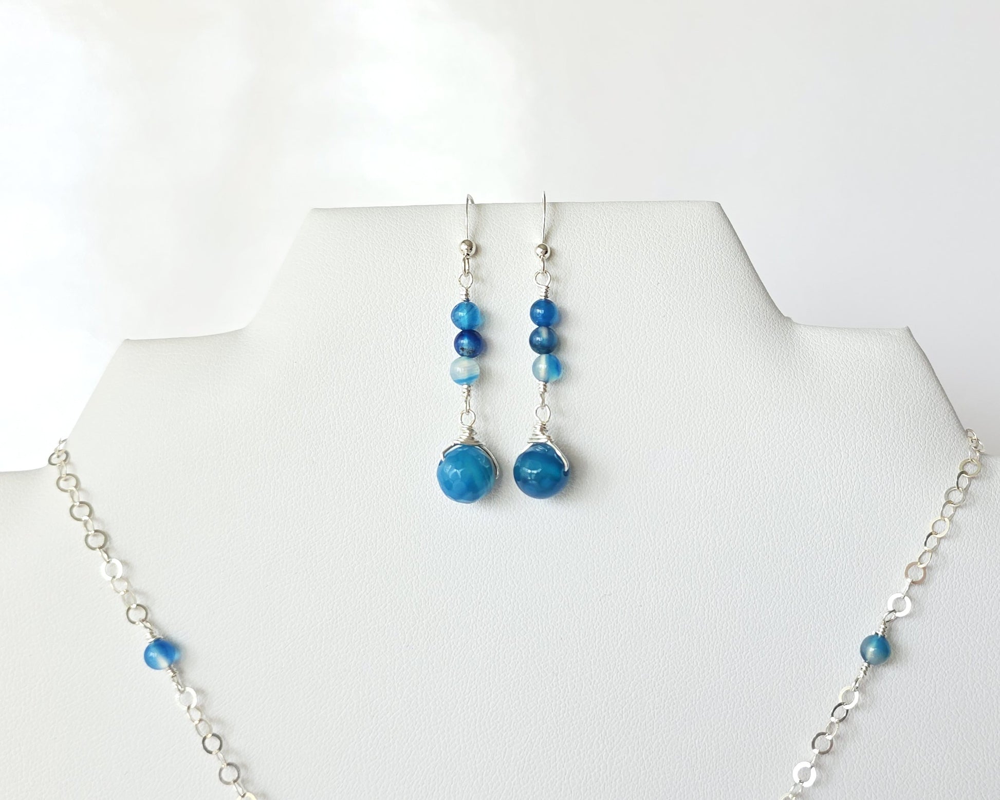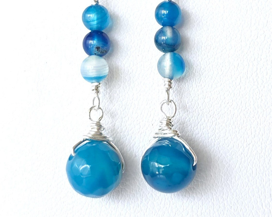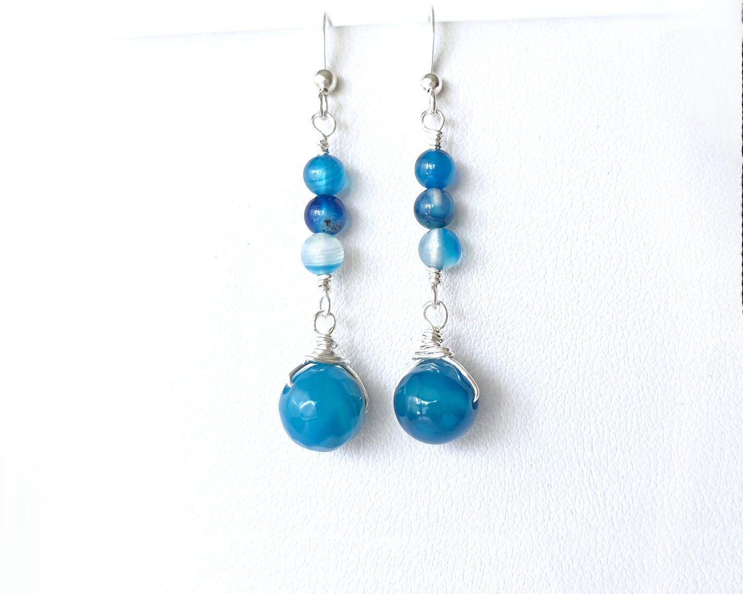 The earrings are made with the same banded blue agates. The dangle style is perfect with the necklace, but, they look amazing on their own. The base stones is an 8mm round faceted stone, decoratively wrapped with three 4mm stones above.