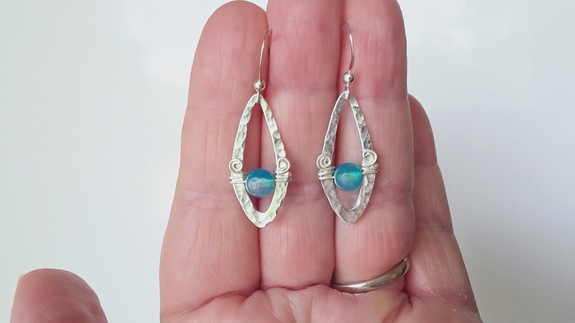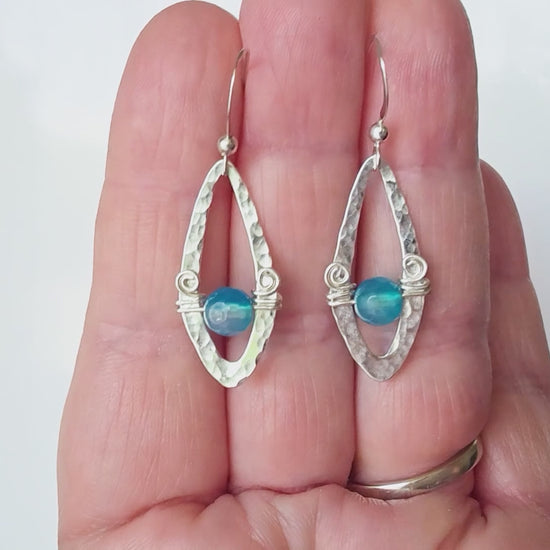 Long Sterling Silver Earrings with vibrant Aqua Blue Banded Agate stones (6mm) set in a wing like, hammered design that reflects light beautifully, I created Celtic Eternity Coils on ether side of the Agates, the design is stunning, earthy and elegant.