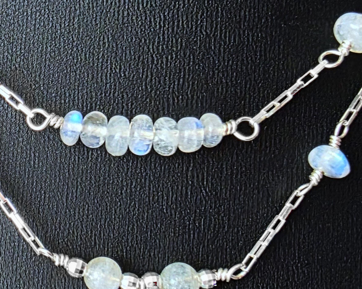 I handcrafted this one of a kind necklace with 925 Sterling silver, securely wrapping the gemstones to the elegant, elongated box link chain with wire to create streams of milky white Moonstones with blue flashes of color (most stones have some blue flashes, they are visible in spots as you move them in the light).