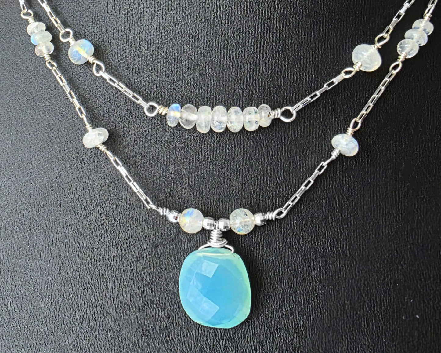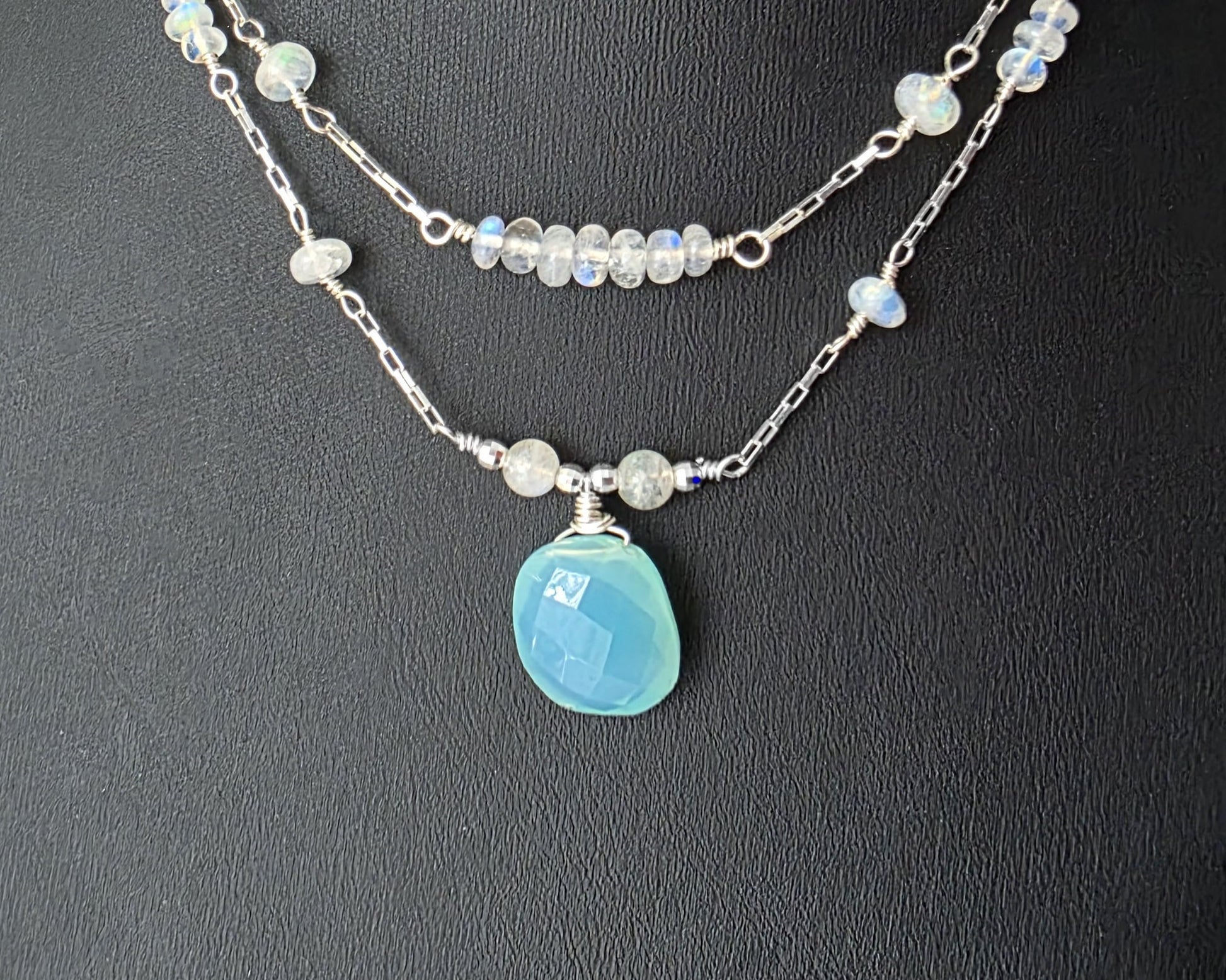 The large faceted aqua blue Chalcedony is accented with sparkly faceted Sterling Silver beads and two round polished Moonstones. The Moonstones along both chains are more rondelle shaped polished stones.