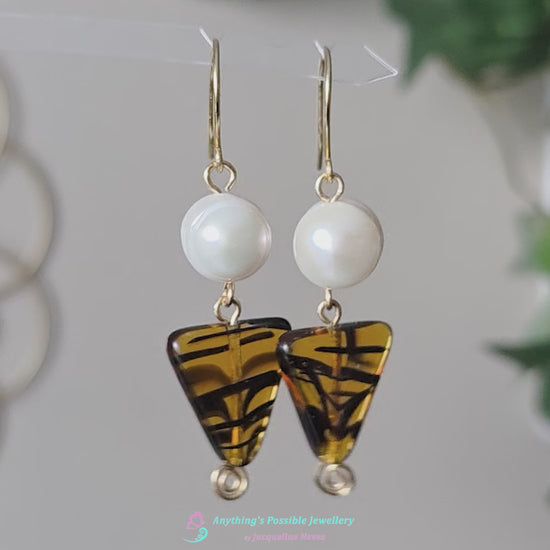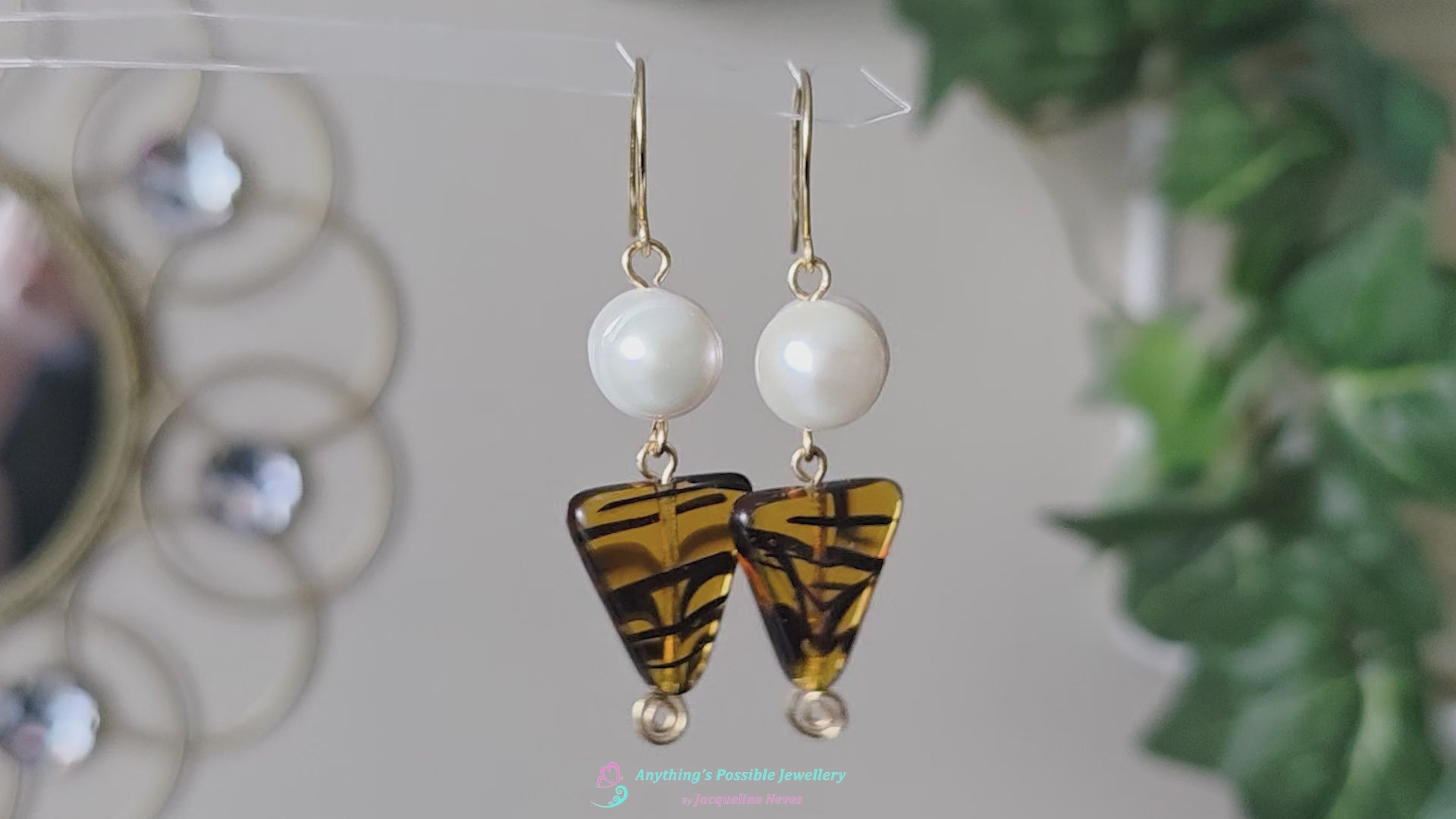 Stunning handmade, one of a kind Large Freshwater Cultured Pearl earrings with inverted triangle shaped glass Tortoise Shell Dangle Earrings. These gorgeous earrings are made to last with solid brass that has a clear protective coating to keep them shinny.