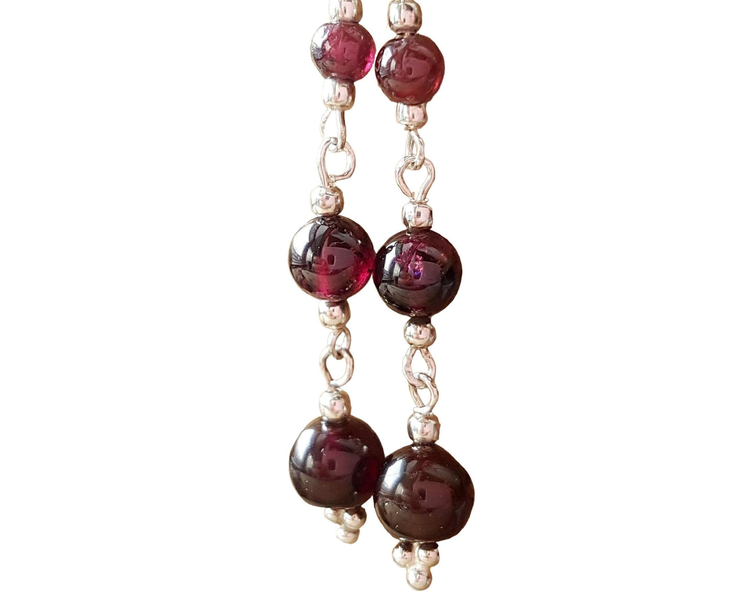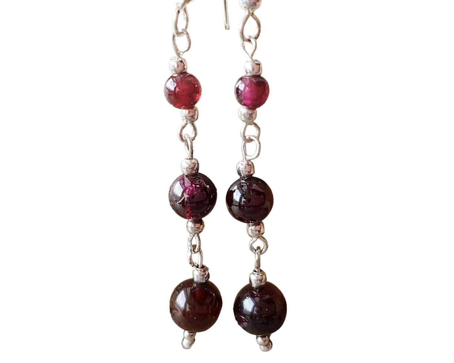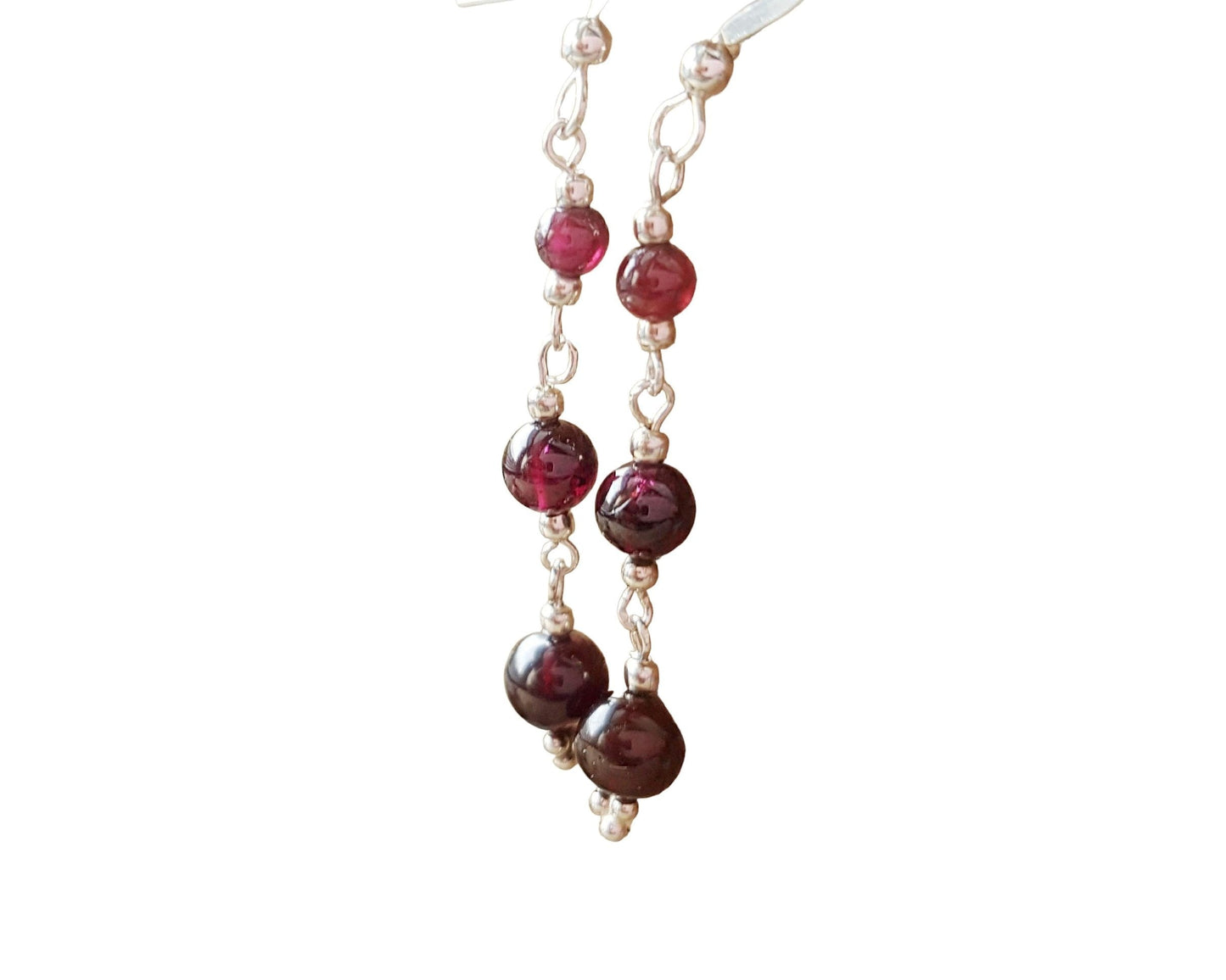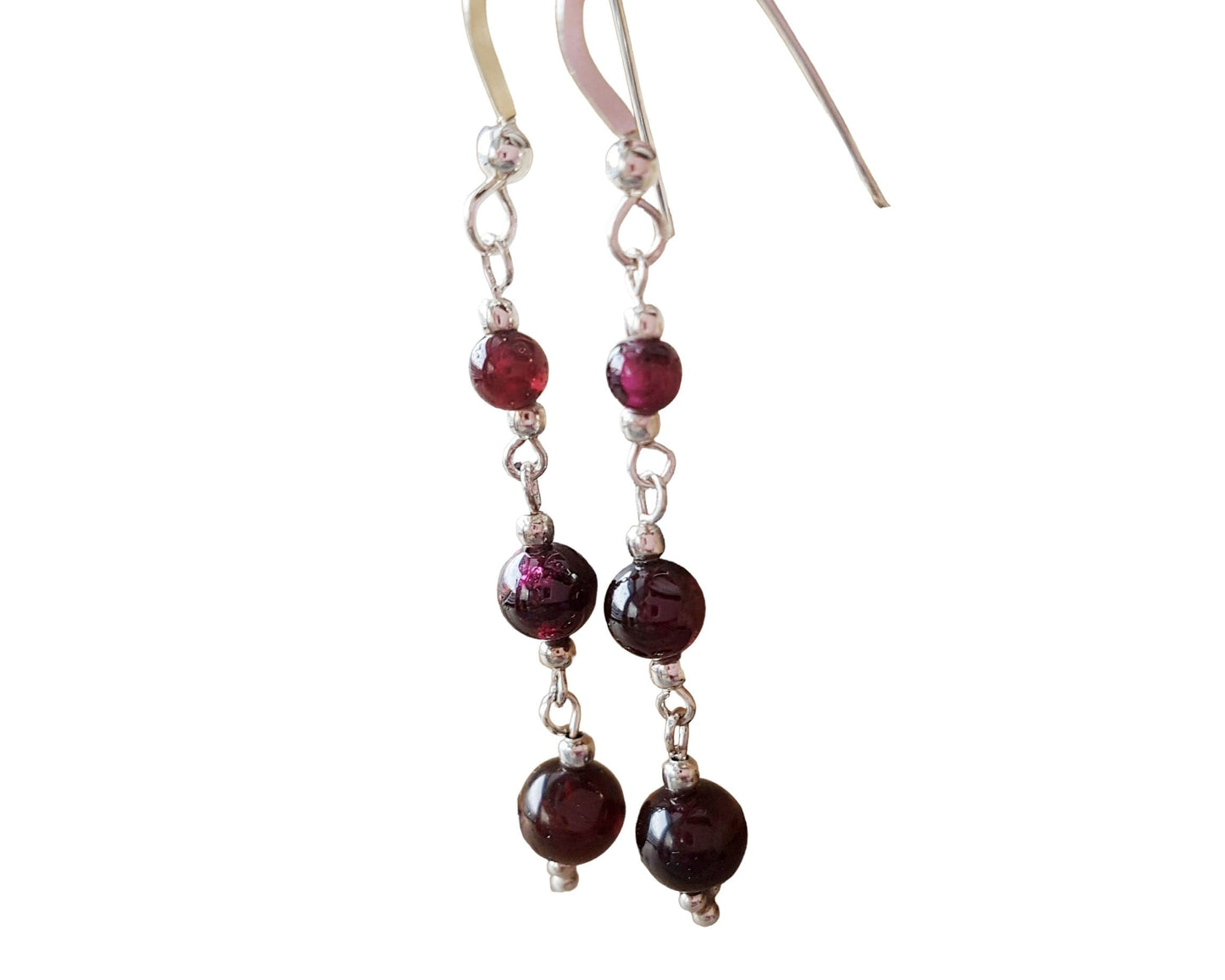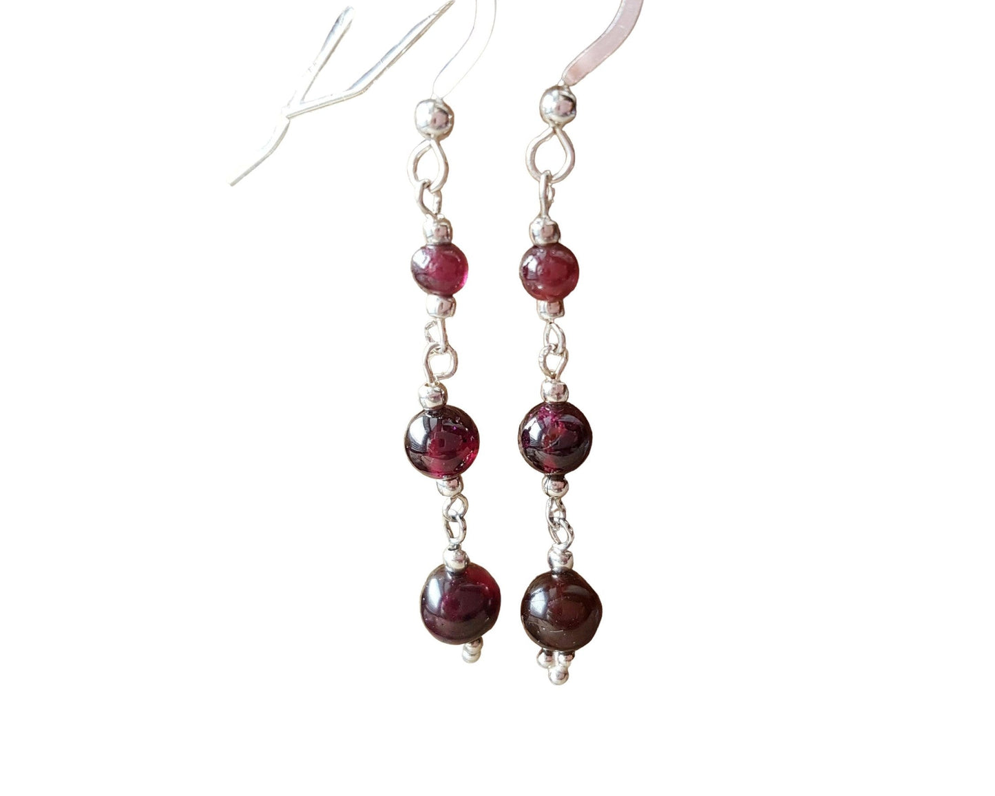 Long elegant, Art Deco inspired Garnet dangle earrings made with rich red genuine garnets. Three round polished Garnets, graduate from the smallest to larger on the base. Each stone is accented with little 3mm Sterling Silver beads. The Garnets graduate in size from smaller to larger on the base (4mm, 5mm and 6mm).