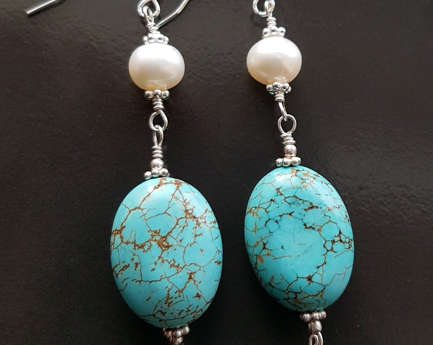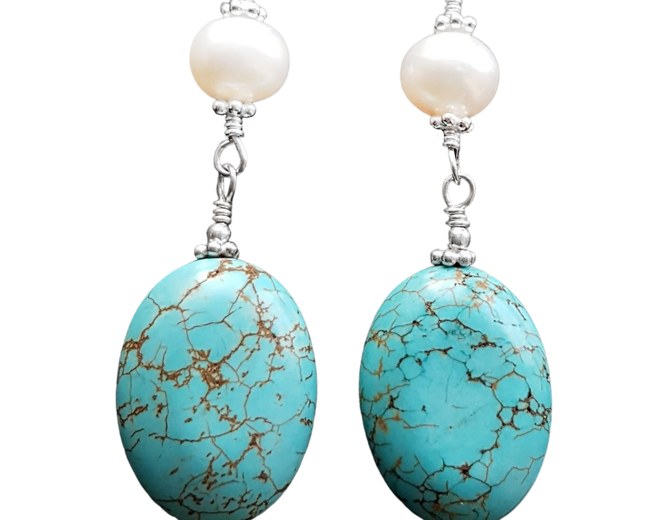 This style of Long Dangle earrings have an Art Deco style, but the earthy look of Turquoise combined with pearls creates a Boho look.