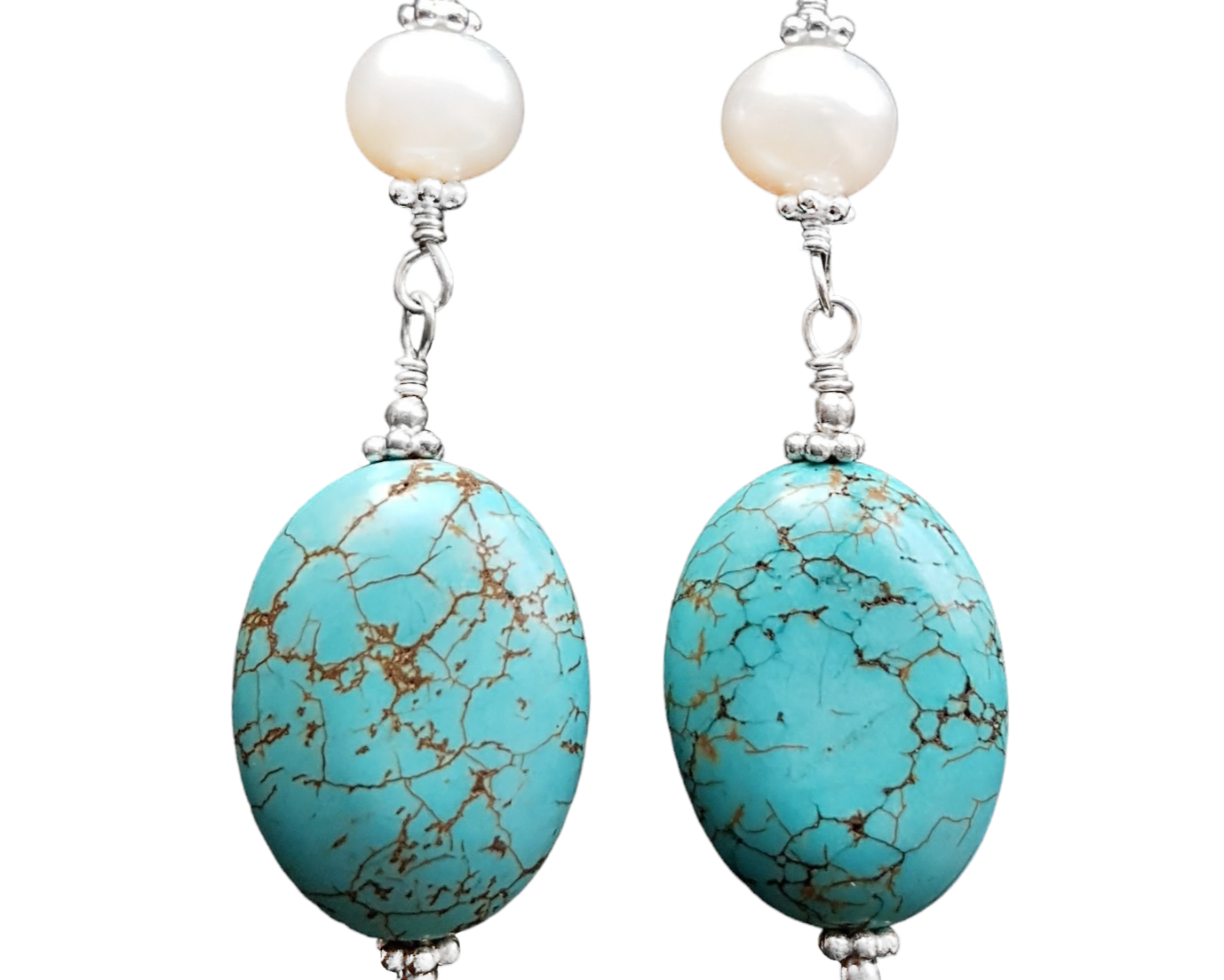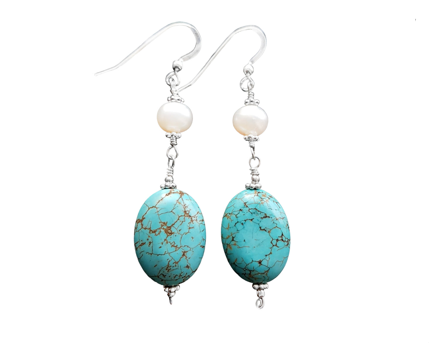 Long Turquoise and Freshwater Cultured Pearl Dangle Earrings