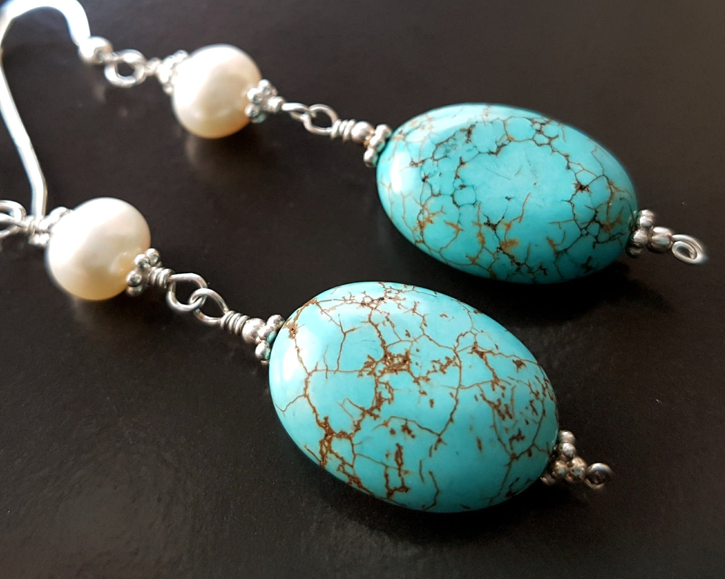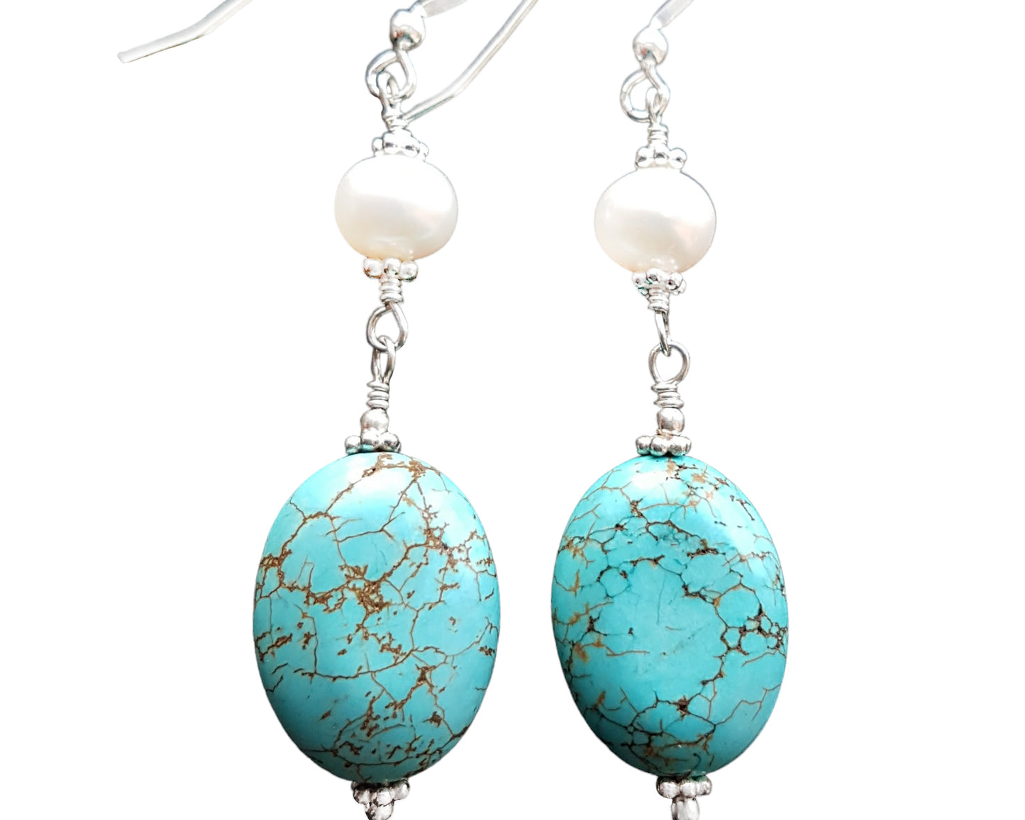 Long Dangle Turquoise Pearl earrings handmade with 925 Sterling Silver, Turquoise and white Freshwater Cultured Pearls.