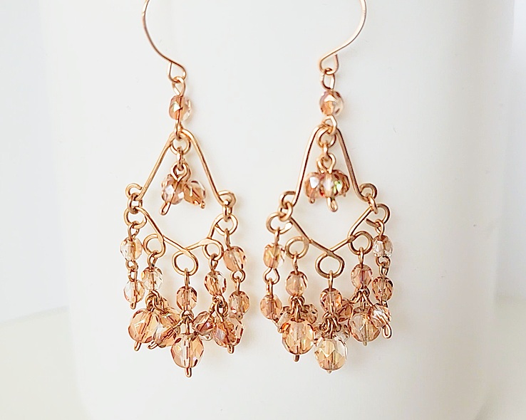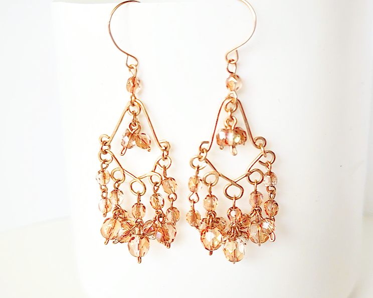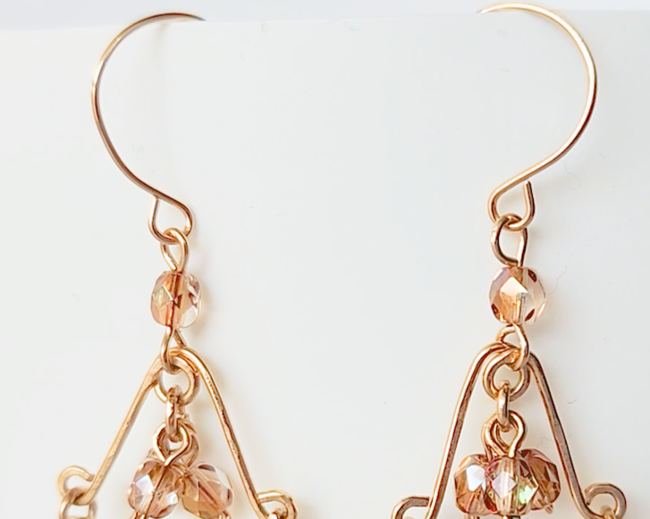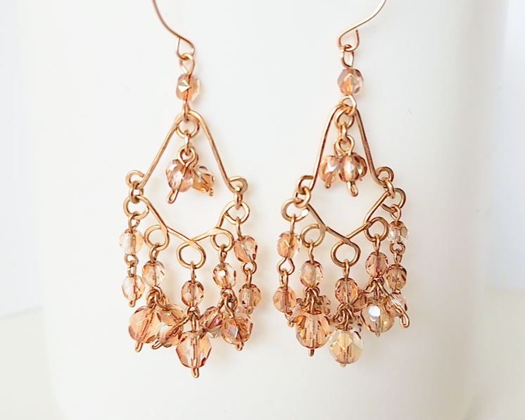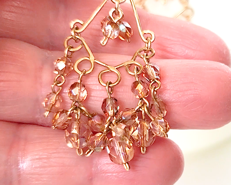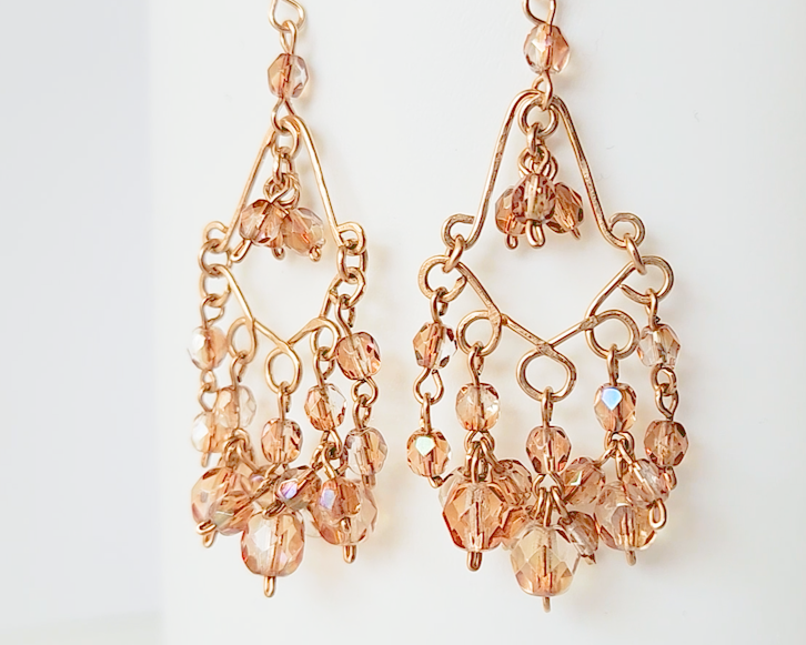 Fabulous, Gold and Champagne Sparkle Chandelier Earrings made with intricate hand forged 14k Gold Filled metal and intricately wire wrapped Brilliant, crystal like, round faceted AB, Czech Fire Polished glass beads (4mm and 6mm) with 14k Gold Filled metal.