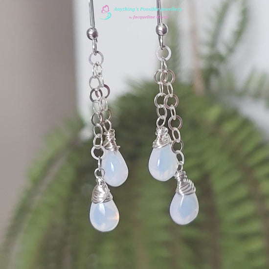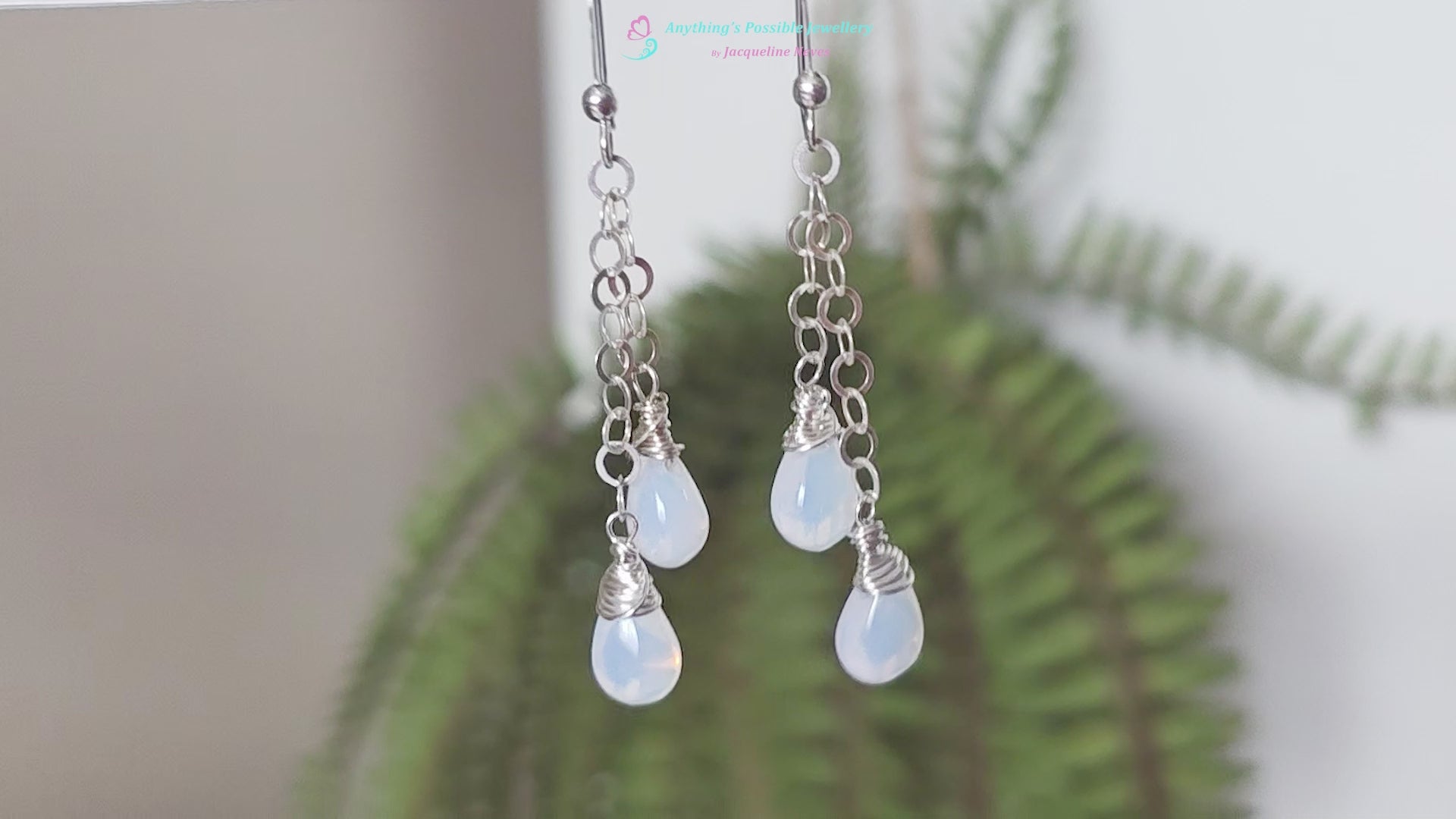Long Sterling Silver double chain earrings with Opalite drops wrapped with Sterling Silver wire to create delicate briolette’s that dangle on the ends of the sparkly flat cable link chain.