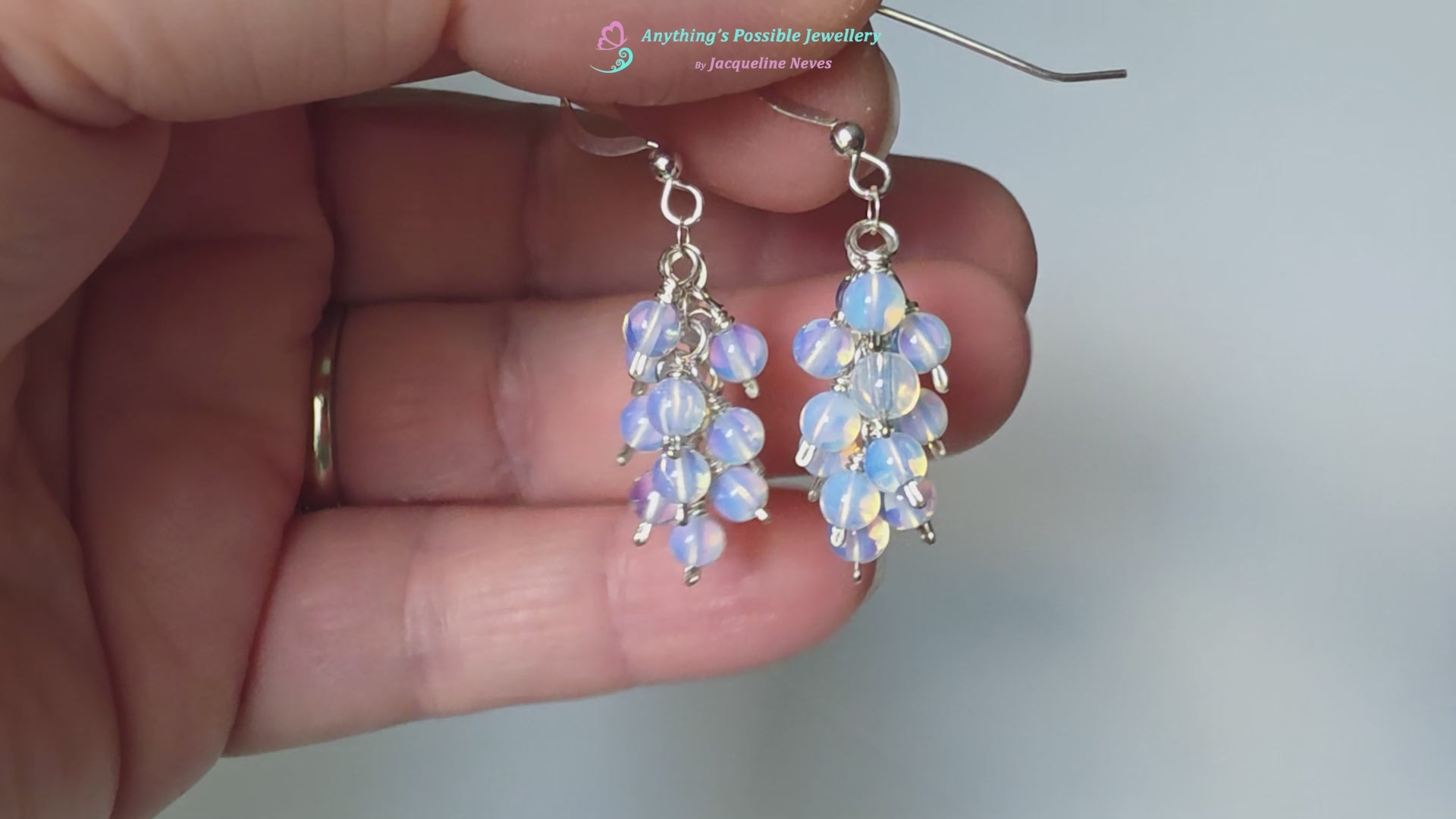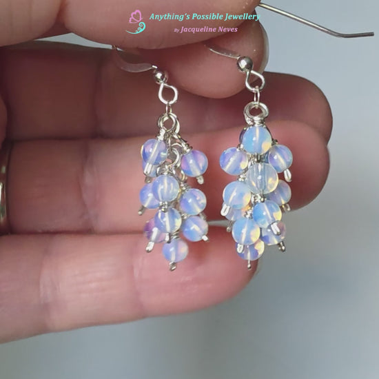 I securely wrapped each little 4mm round polished Opalite with Sterling Silver wire to a flat cable link chain to create luminous clusters of imitation Opals that dangle from the earring wires of your choice.