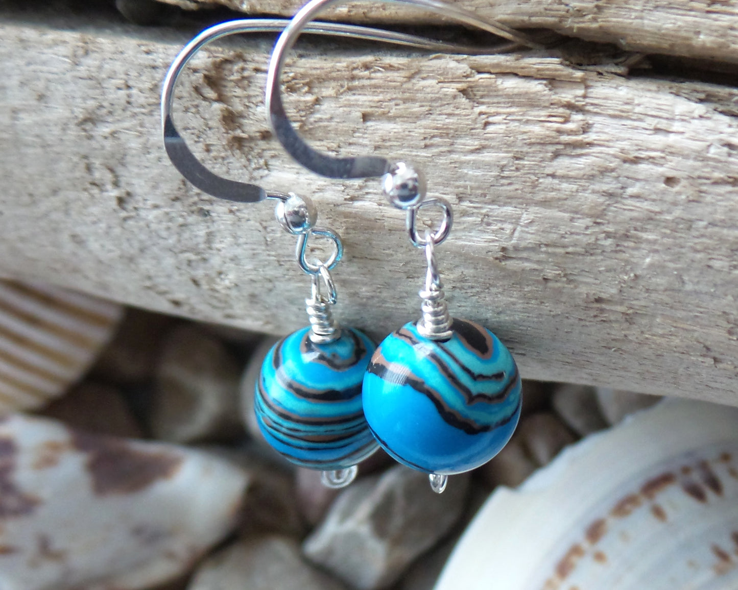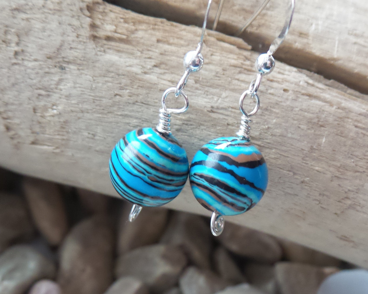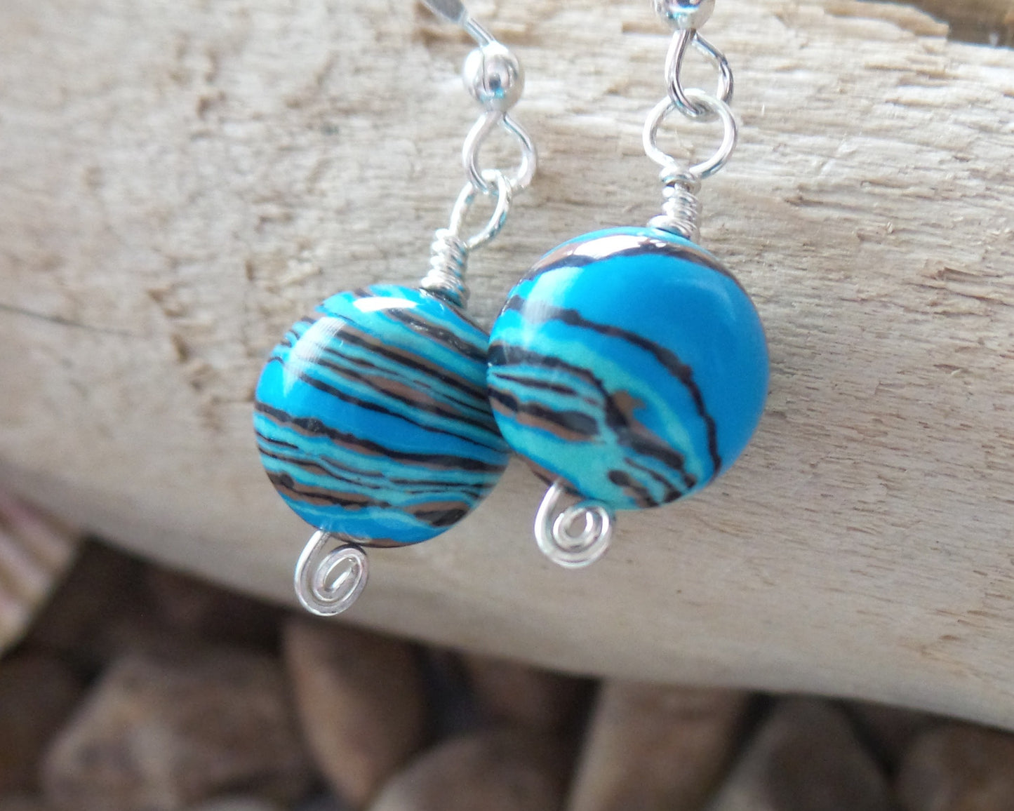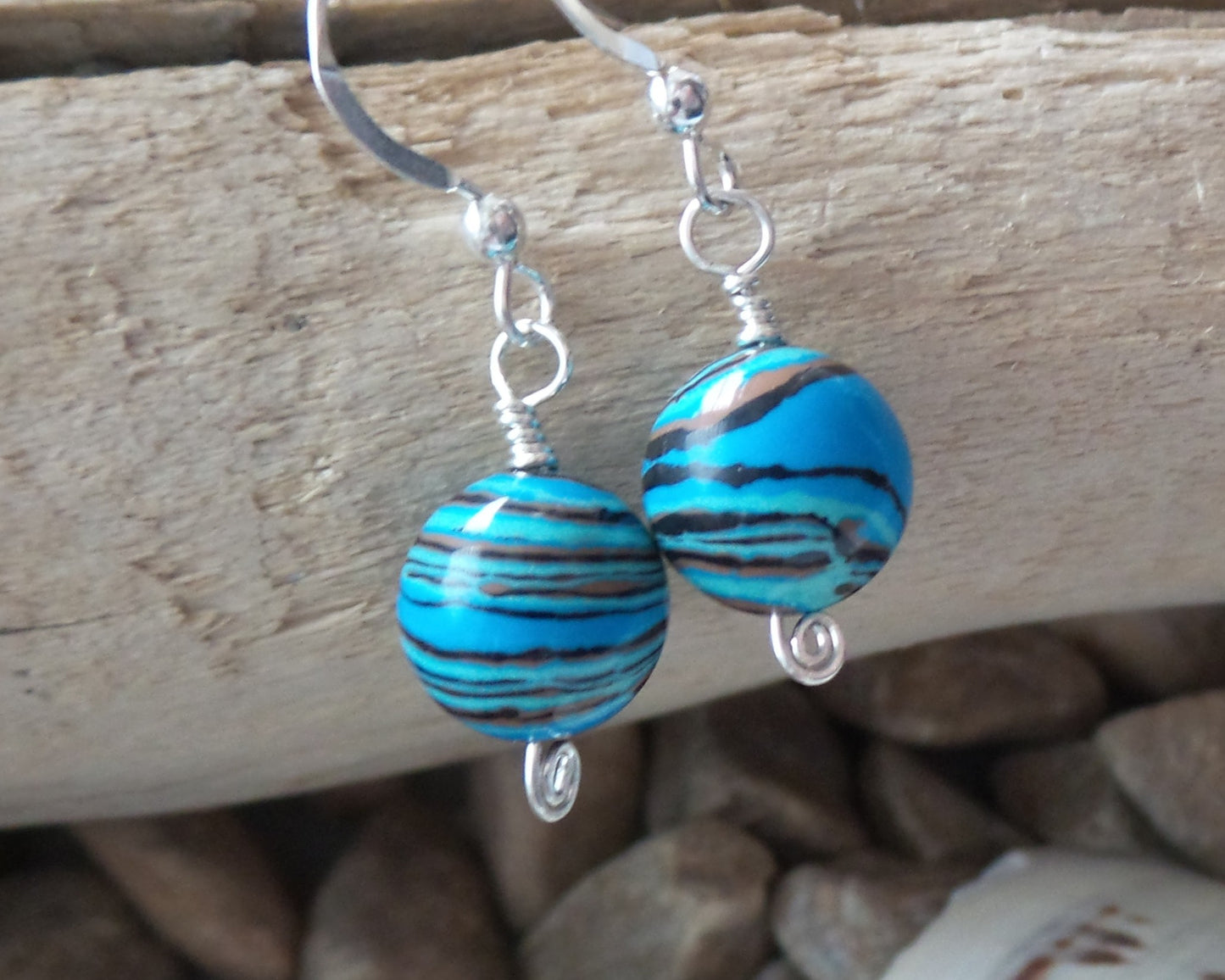 Handmade, one-of-a-kind Sterling Silver dangle drop earrings with two dangling Malachite Jasper stones (composite stones) with wonderful colors (turquoise, blue, black and brown, they look amazing with the Celtic inspired Eternity coils on the base of each stones. The coils compliment the swirls of colors that surround the stones. These Earrings represent Eternal Joy, Forever, the never-ending cycle of life.