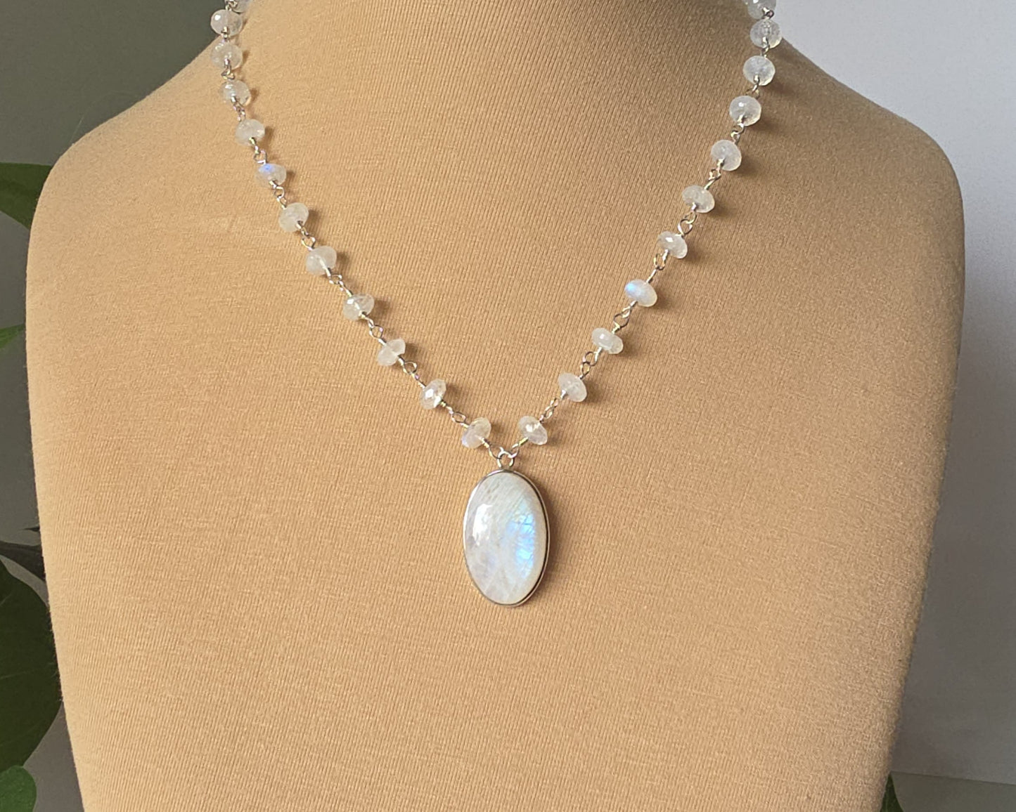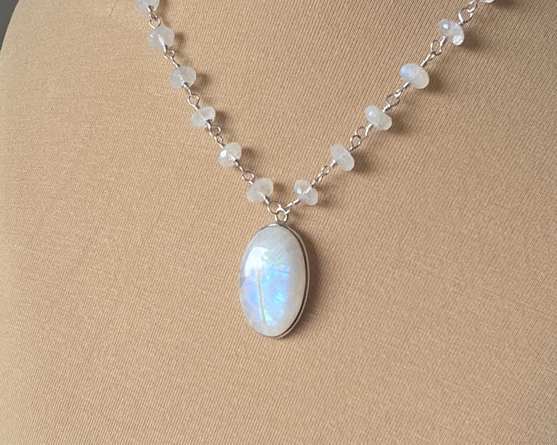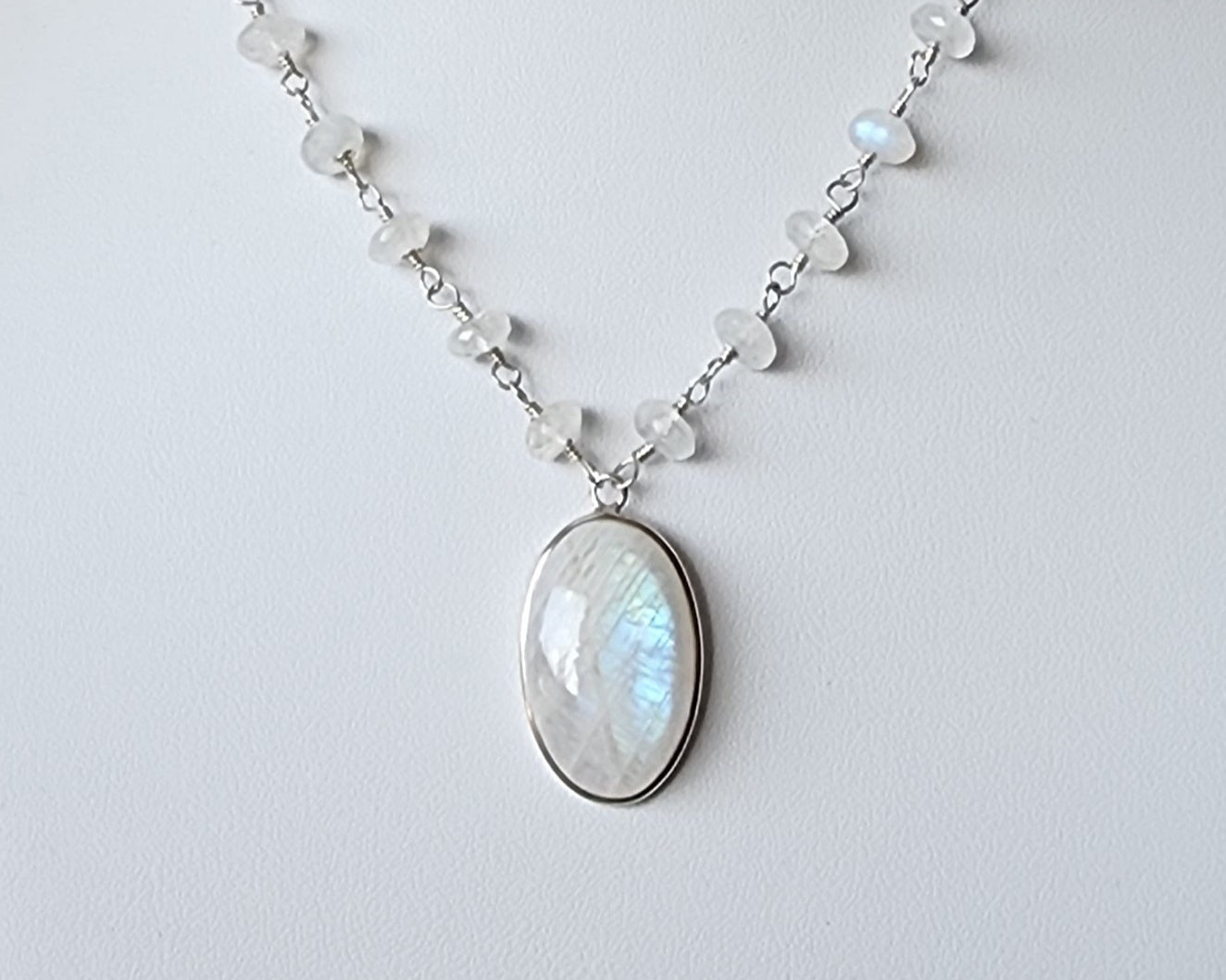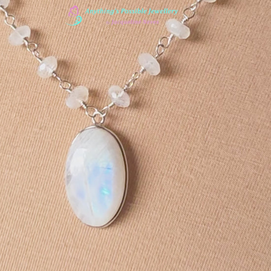 Stunning Moonstone Necklace featuring a large oval shaped bezel set moonstone with incredible blue flashes of color and a stream of faceted Moonstones all around the neck. Each stone roundel shaped Moonstone is securely wrapped with Sterling Silver wire.