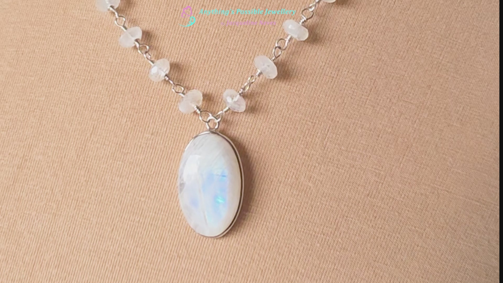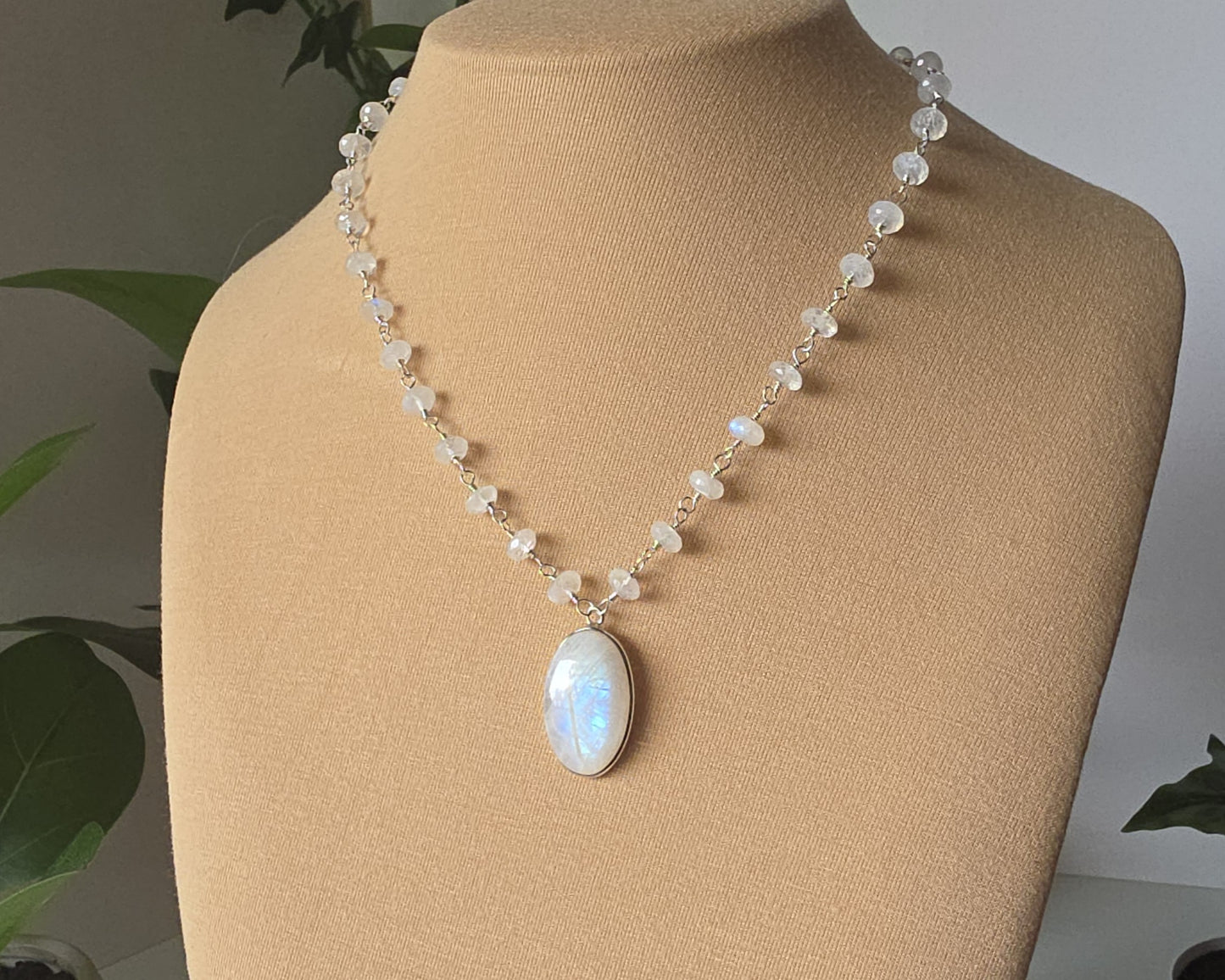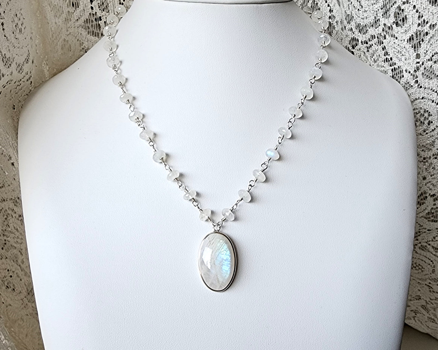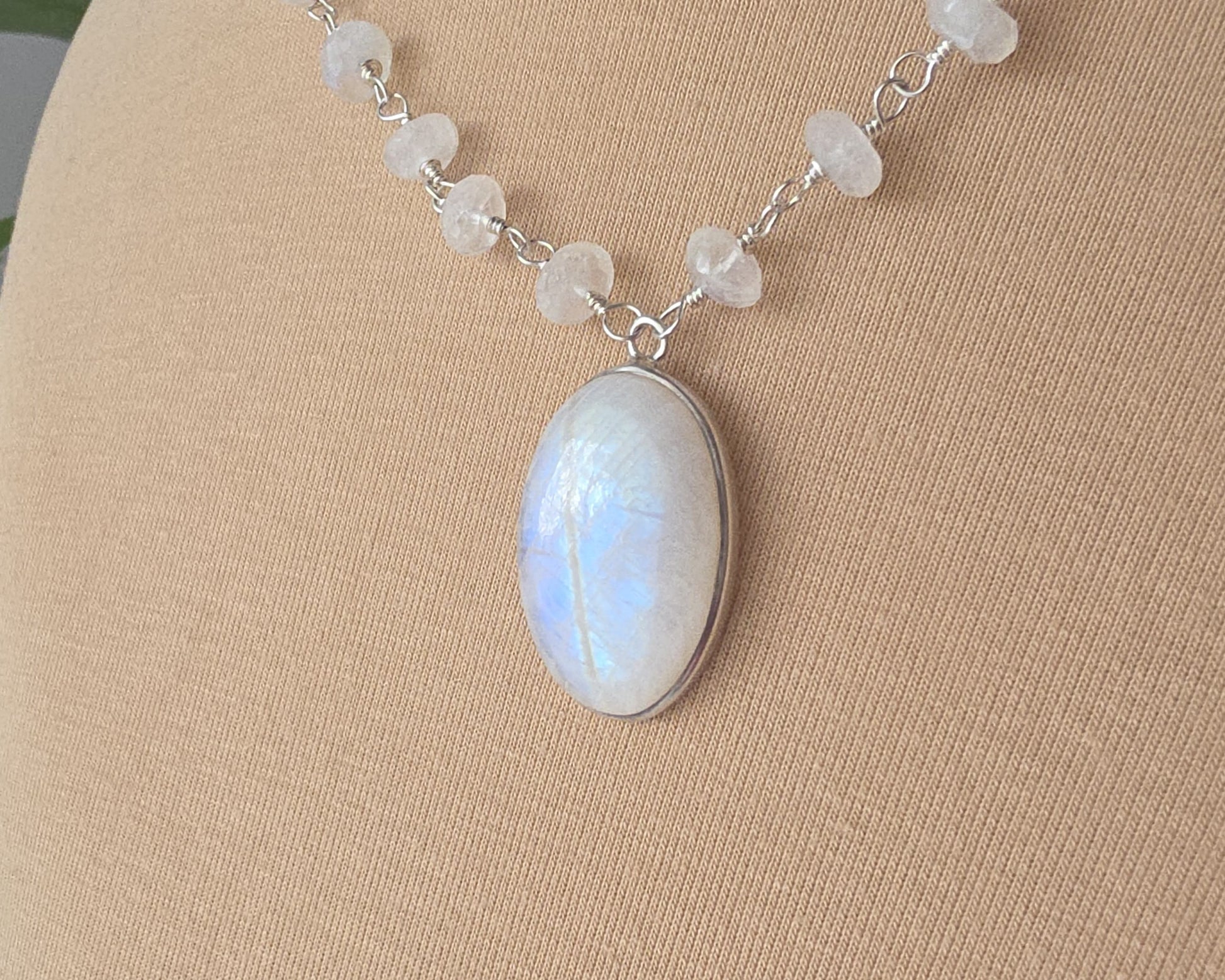 Stunning Moonstone Necklace featuring a large oval shaped bezel set moonstone with incredible blue flashes of color and a stream of faceted Moonstones all around the neck. Each stone roundel shaped Moonstone is securely wrapped with Sterling Silver wire.