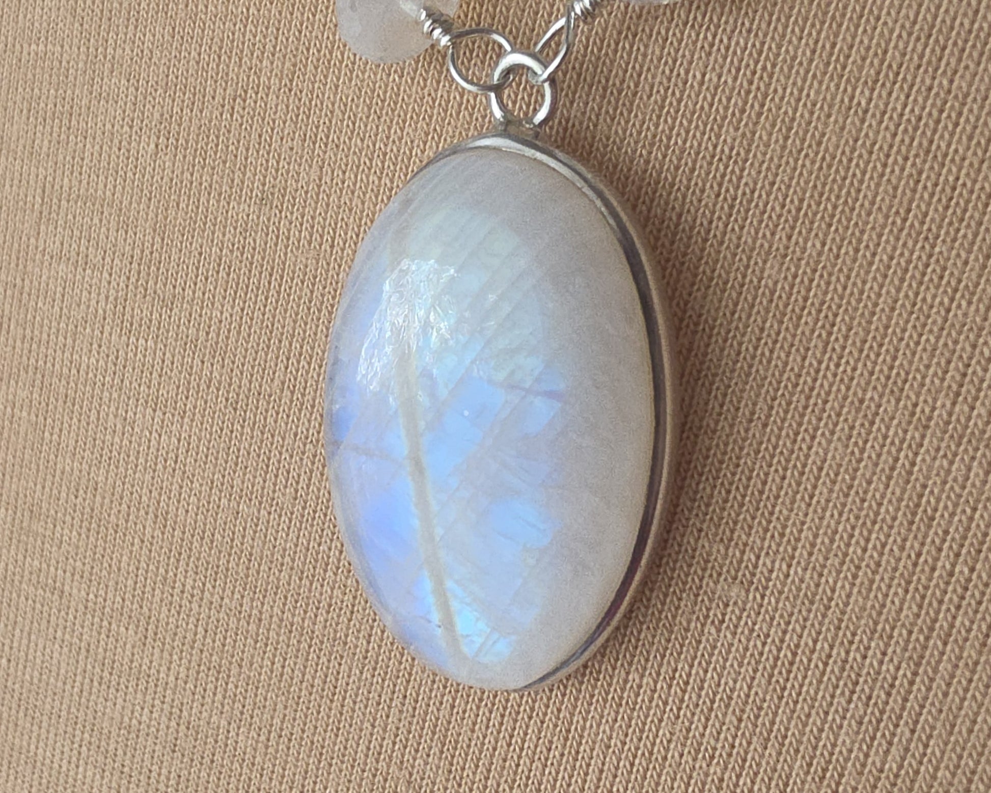 The large oval shaped Moonstone pendant has an open back so you can enjoy the beautiful flashes of color on the back of the stone as well, it reminds me of a butterfly wing, but you can only see the color at certain angles. The effect is called adularescence. The pendant measures (32mm x 18mm) 1 ¼” x 13/16”.