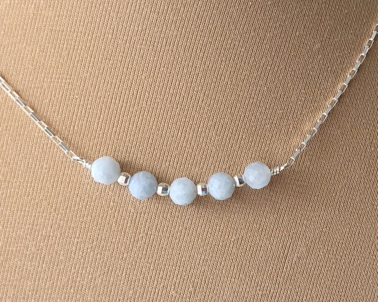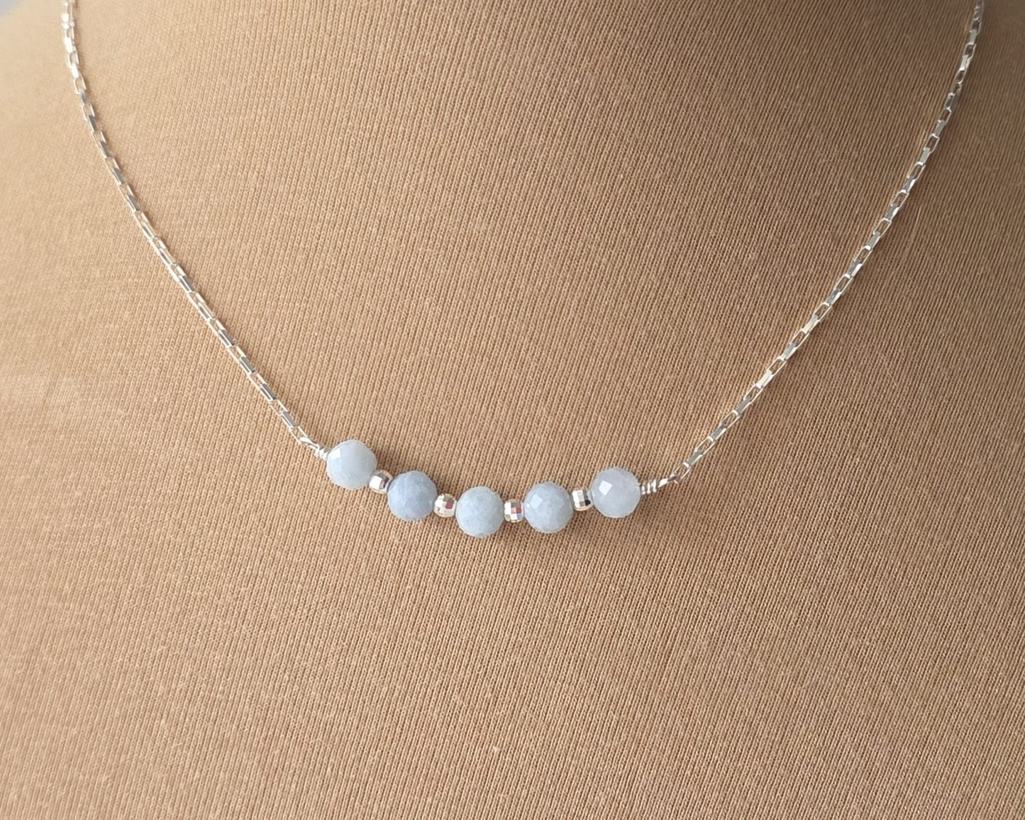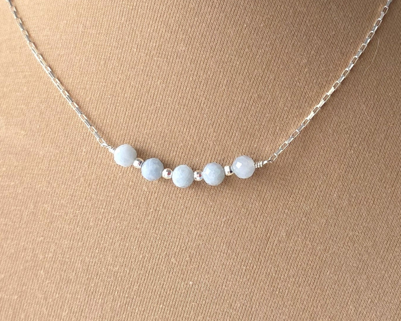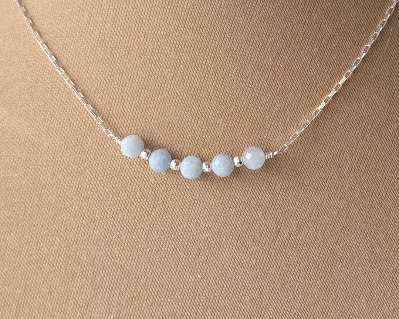 Aquamarine beaded bar style necklace made with high quality faceted Aquamarine stones and sparkly faceted Sterling Siler beads.