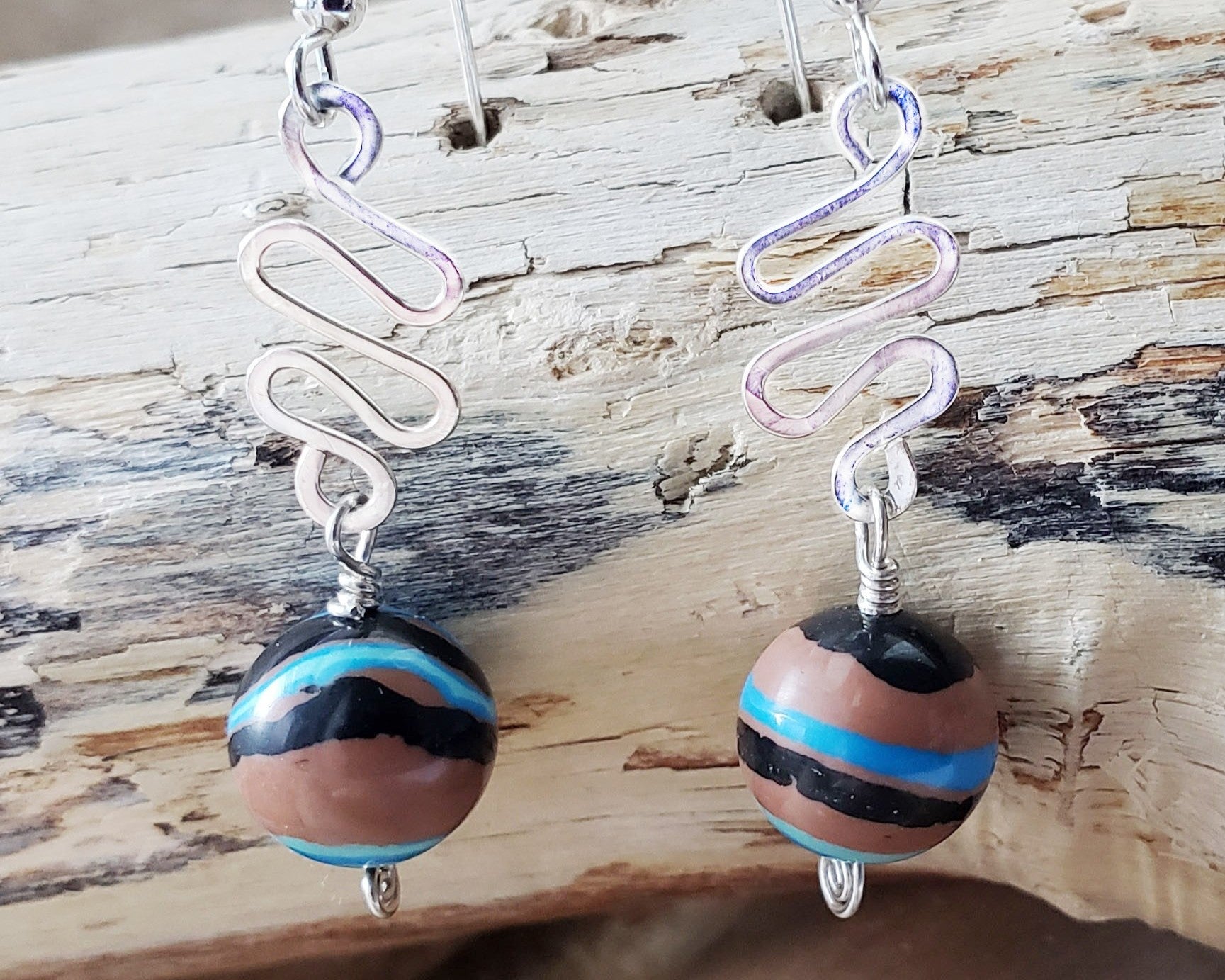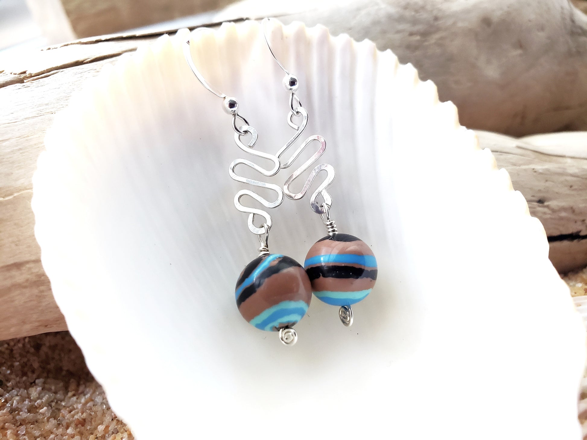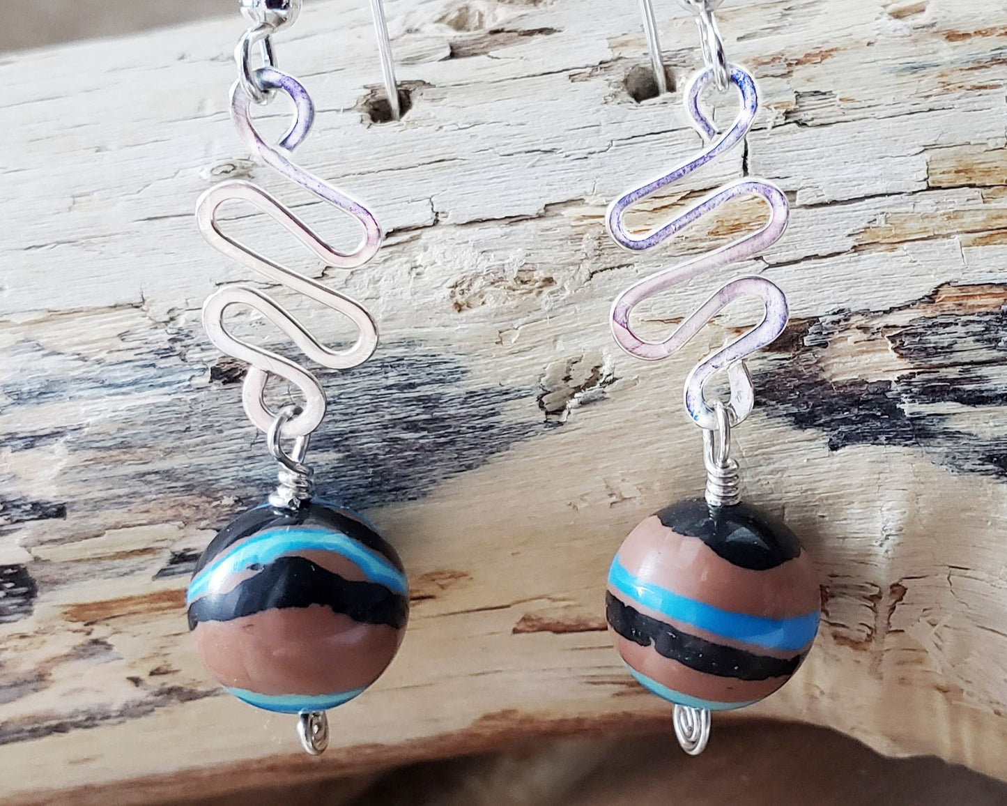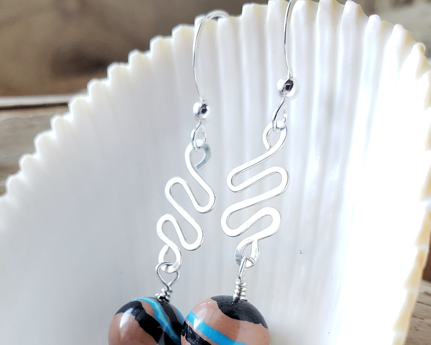 Handmade, one of a Kind Sterling Silver Earrings with a hand forged swirling river design and two dangling Malachite Jasper stones (composite stones) with wonderful colors (turquoise, blue, black and brown, they look amazing dangling from the Sterling Silver swirling river design.