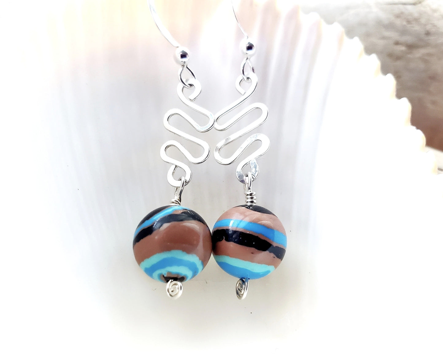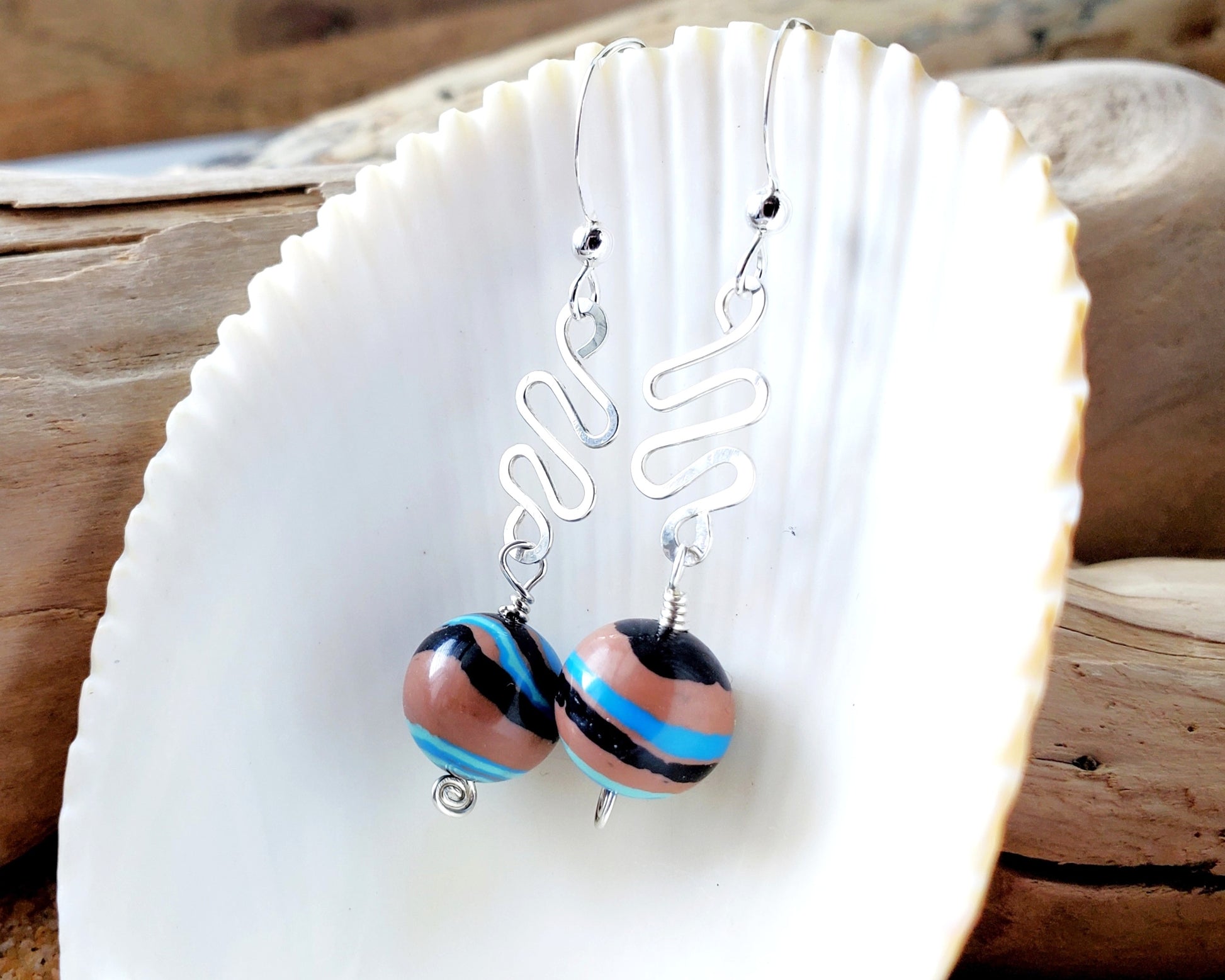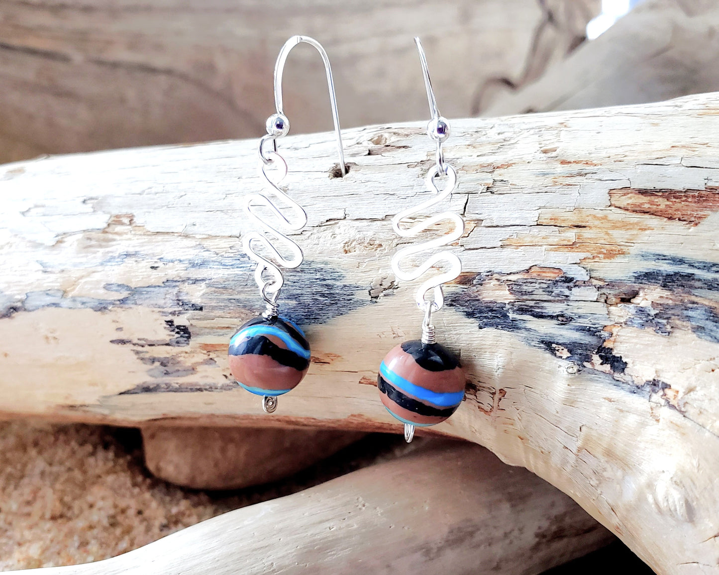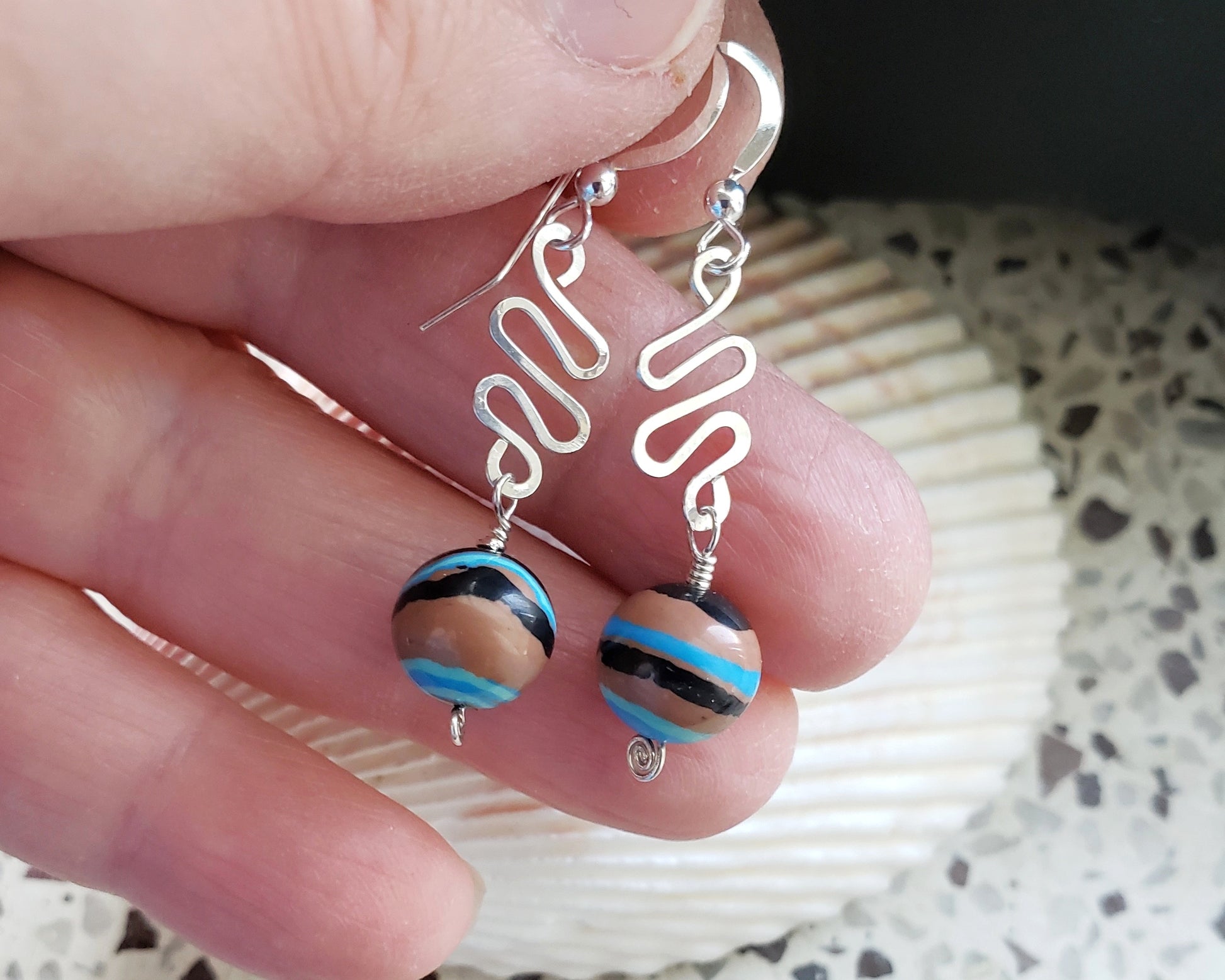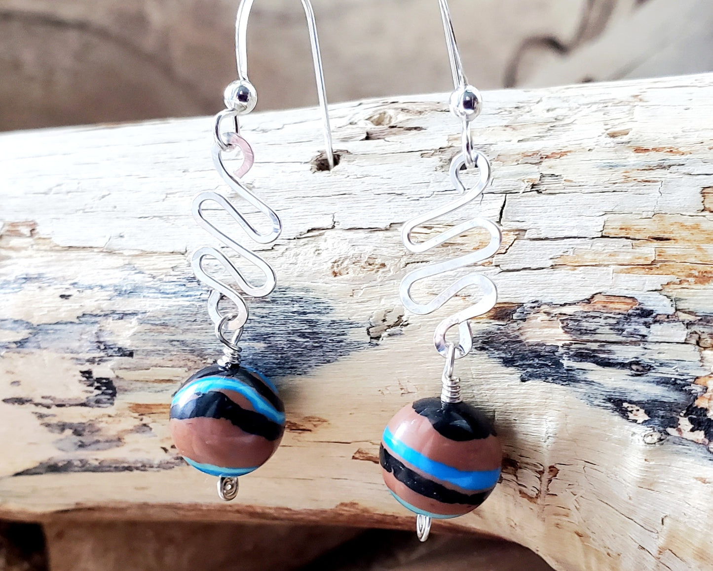 Handmade, one of a Kind Sterling Silver Earrings with a hand forged swirling river design and two dangling Malachite Jasper stones (composite stones) with wonderful colors (turquoise, blue, black and brown, they look amazing dangling from the Sterling Silver swirling river design.