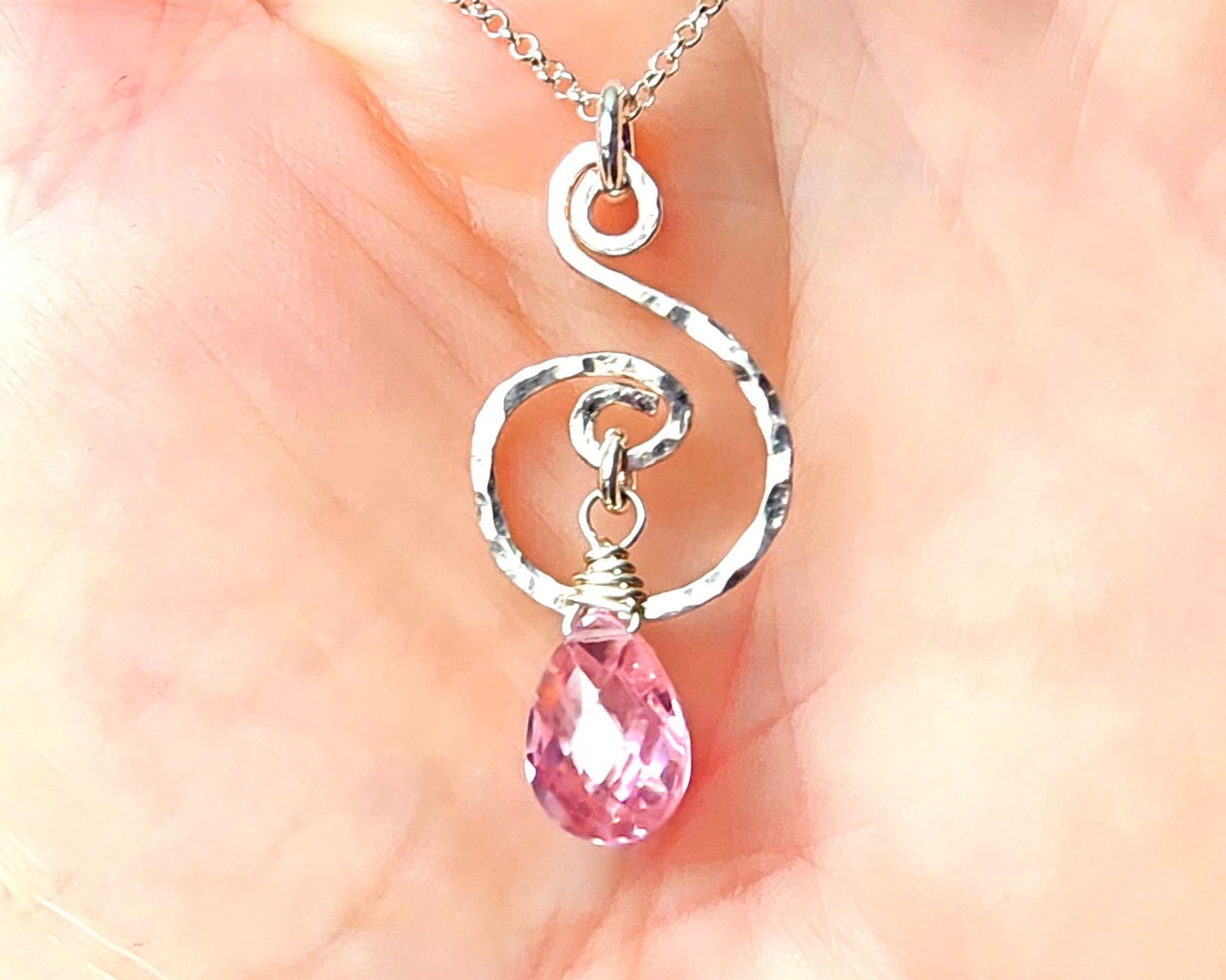 Celtic inspired Sterling Silver pendant with a swirling, hand forged design with hammered texture to reflect light and a brilliant drop shaped faceted pink Cubic Zirconia dangle.