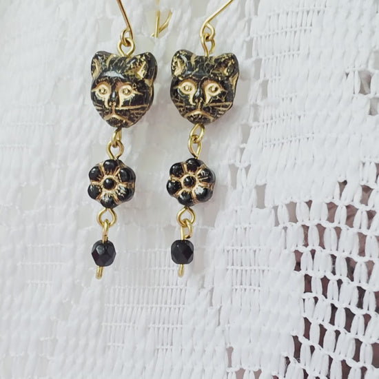 Long Victorian Style Cat Earrings, handmade with gorgeous Black Czech glass Cat heads with gold details, black flowers with gold details and faceted Czech fire polished glass crystals dangling on the base of the earrings.