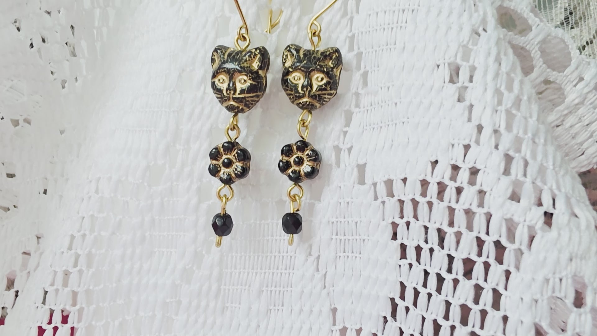 The Czech glass Cat beads (13mm x 11mm) are three dimensional as well as the black flower beads (8mm x 4mm). The little black faceted Czech fire polished glass beads (4mm) sparkle on the end of the earrings and the gold detail is accentuated by the gold color brass.