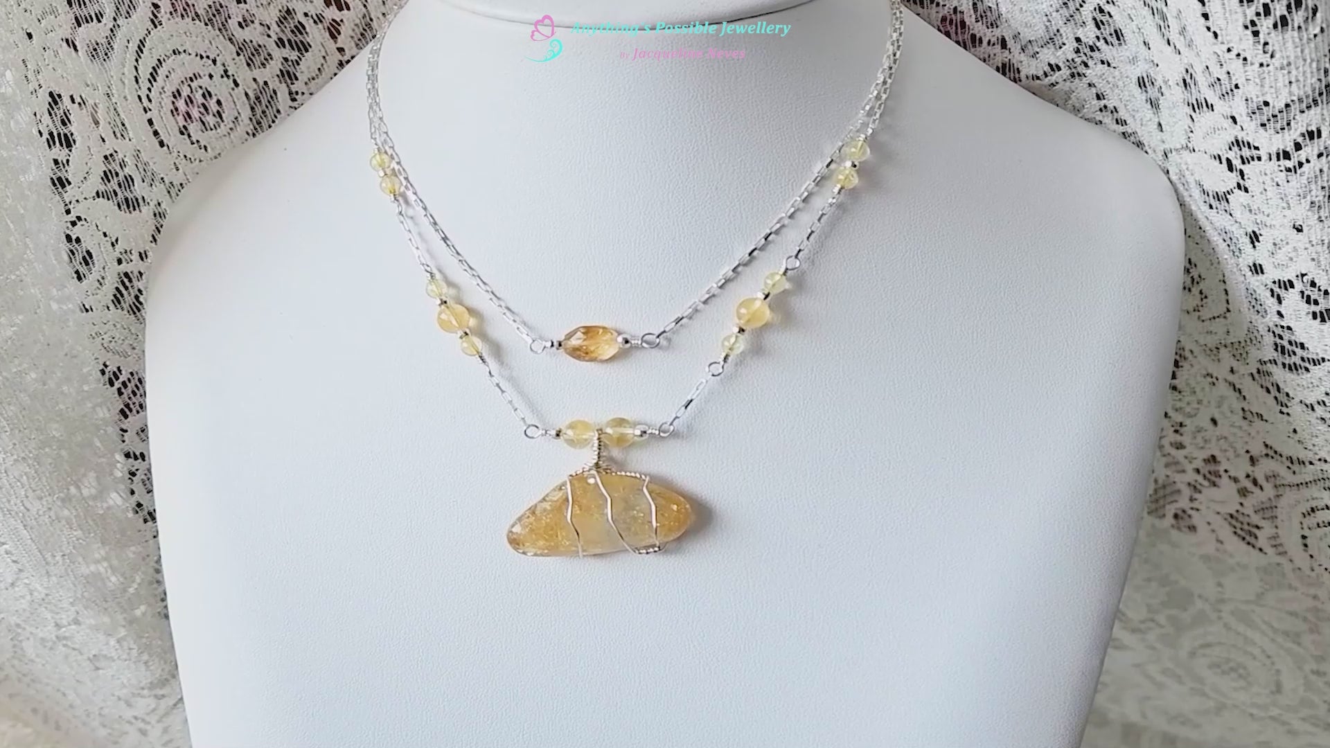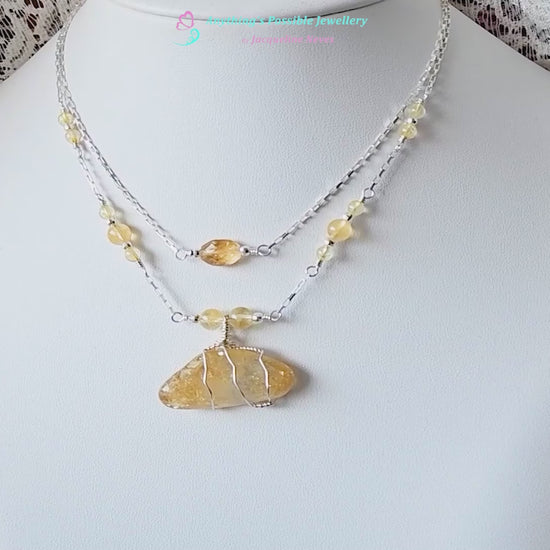 The organic looking Citrine pendant dangles from the second strand of the necklace attached to an elongated box chain and smaller round polished Citrine stones (4 x 6mm, 8 x 4mm), accented with sparkly faceted Sterling Silver beads (3mm).